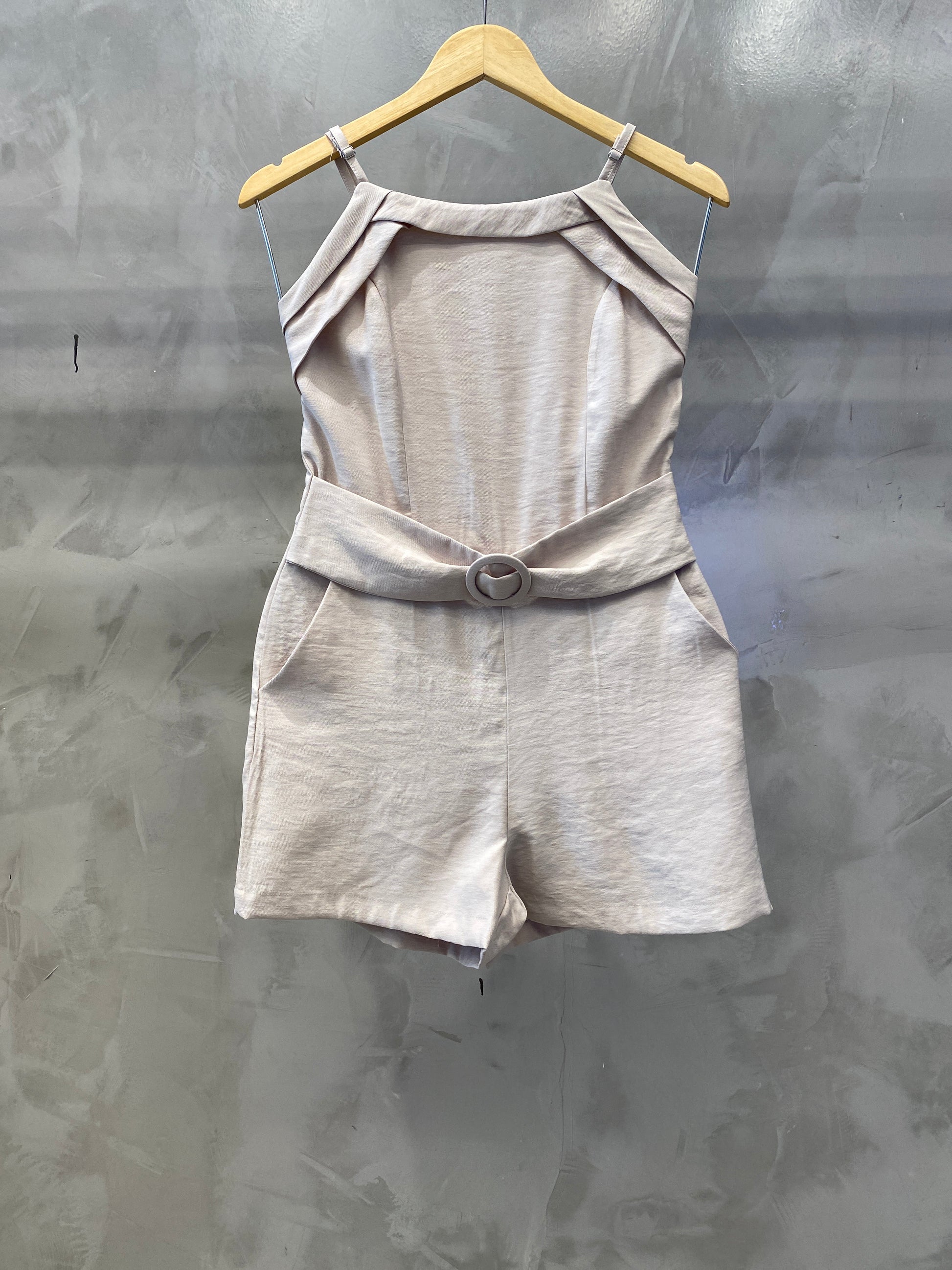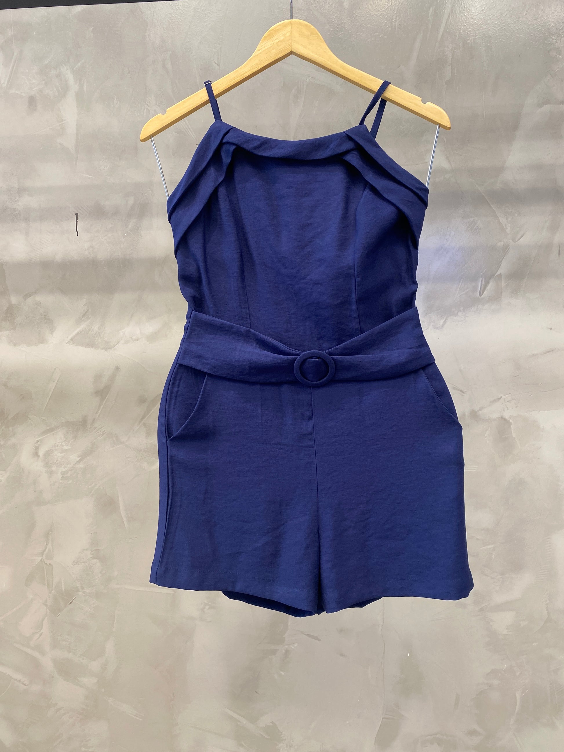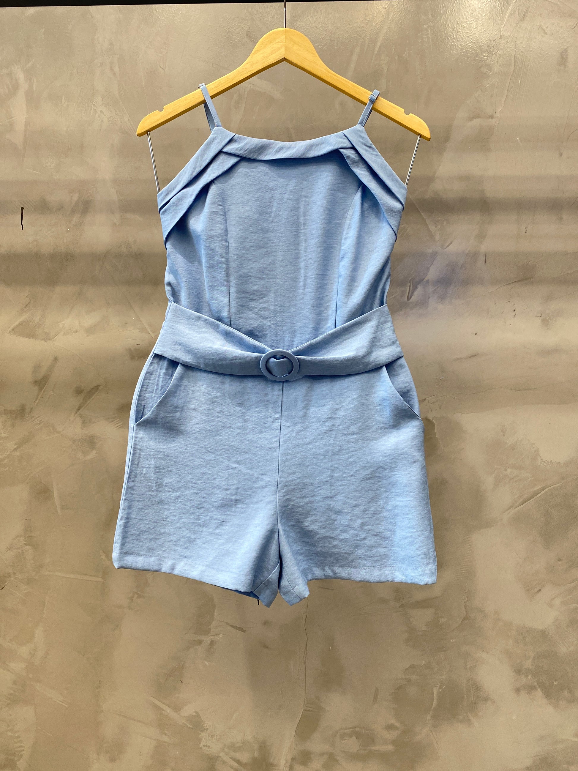 Macaquinho liso com dobras no decote redondo, alças finas com reguladores e cinto forrado embutido que dá todo charme na peça. Tem zíper traseiro, bolsos laterais e possui forro.
