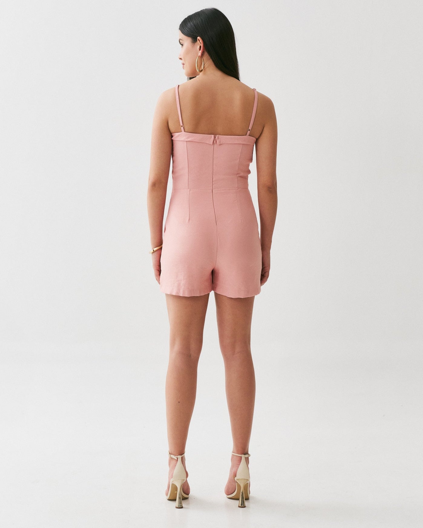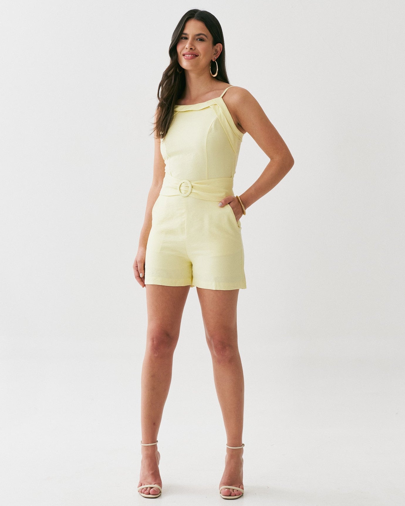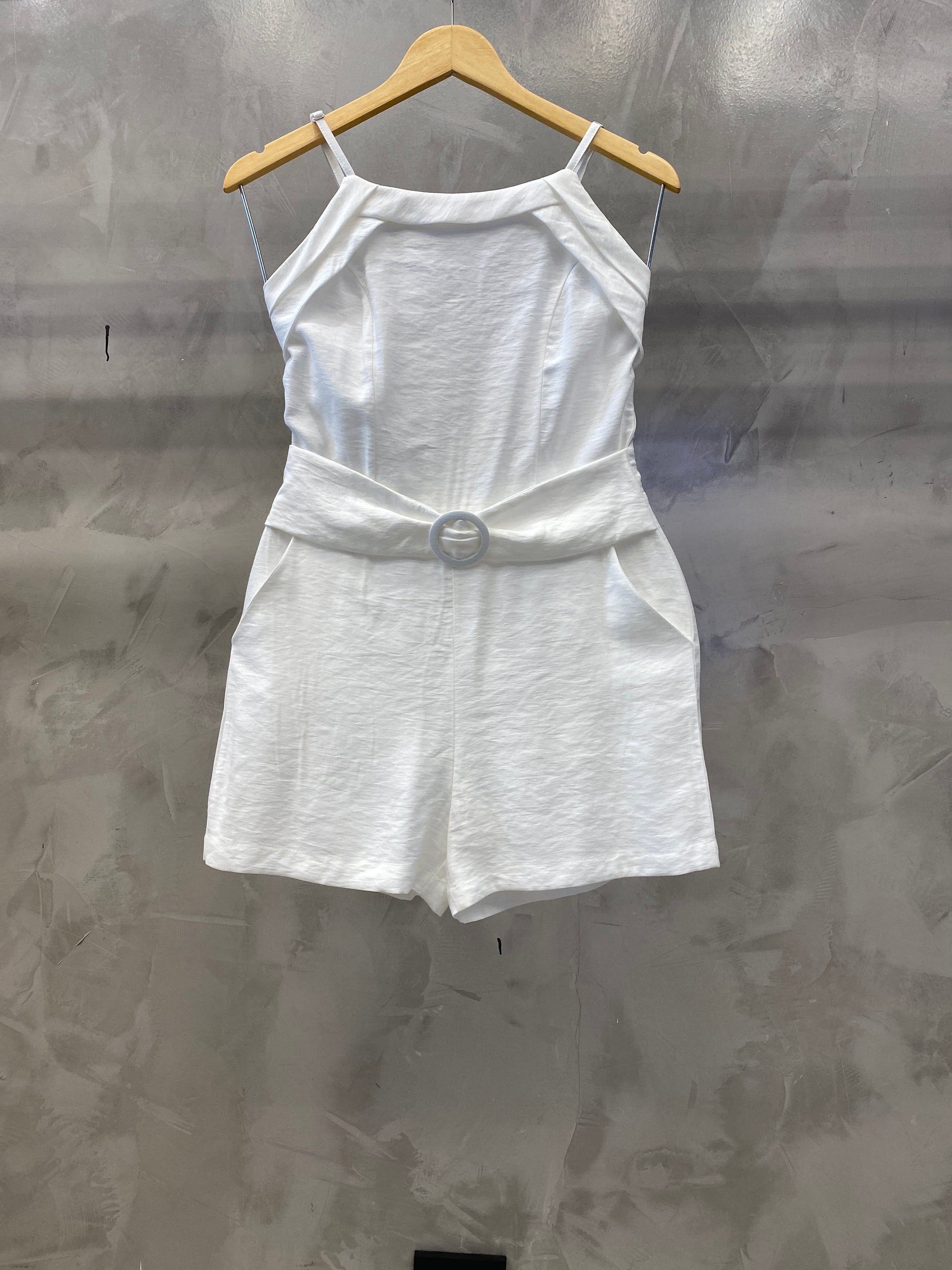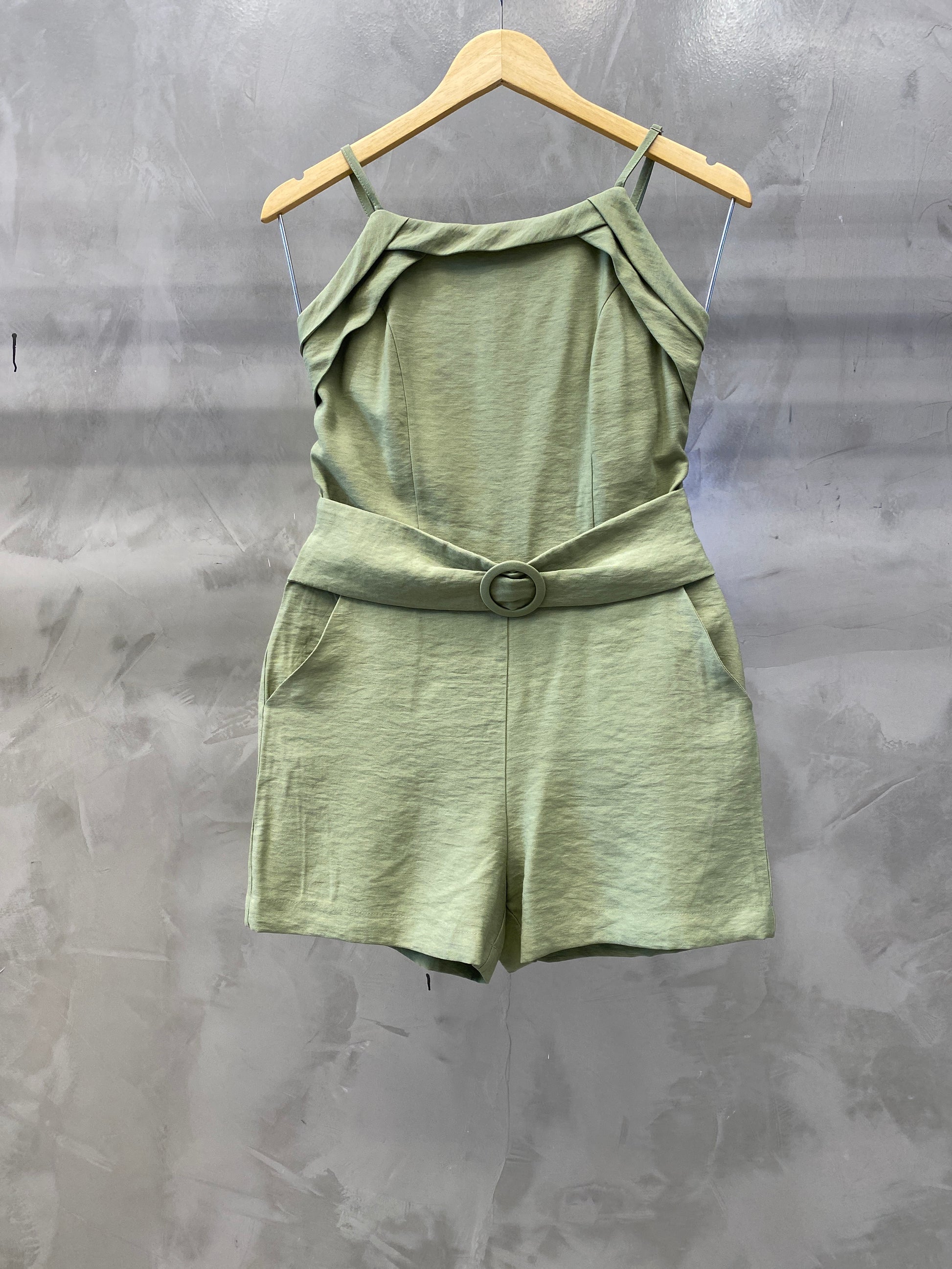Macaquinho liso com dobras no decote redondo, alças finas com reguladores e cinto forrado embutido que dá todo charme na peça. Tem zíper traseiro, bolsos laterais e possui forro.