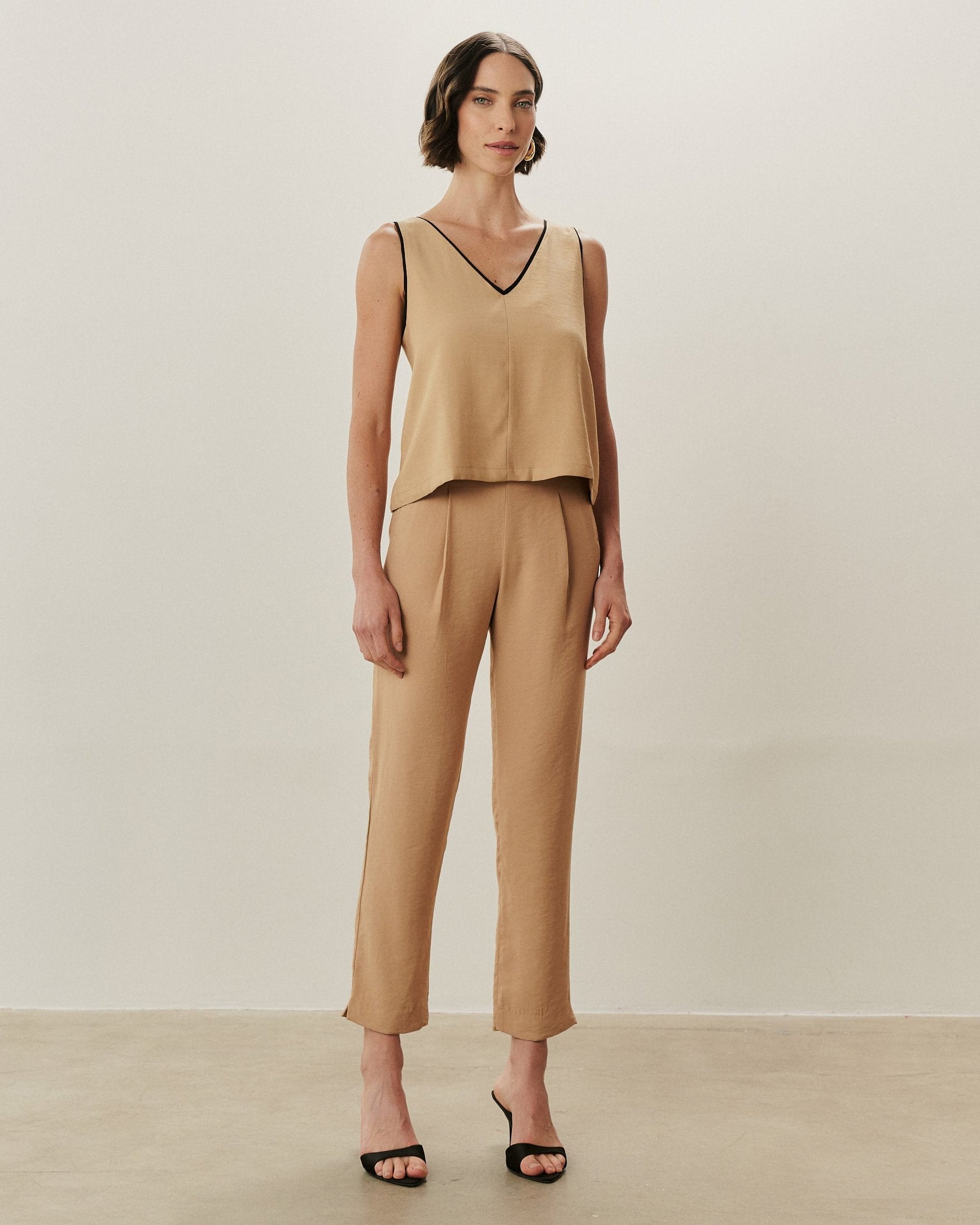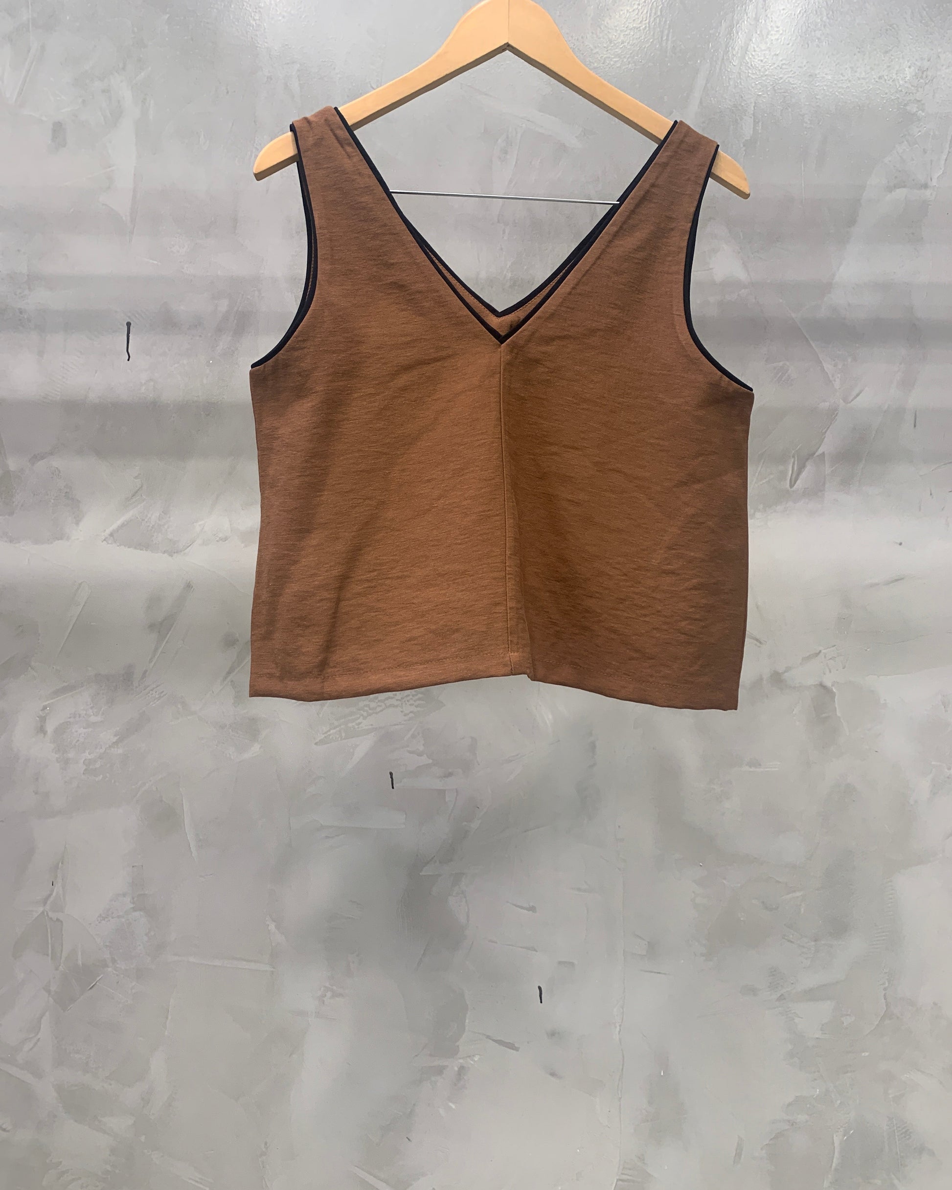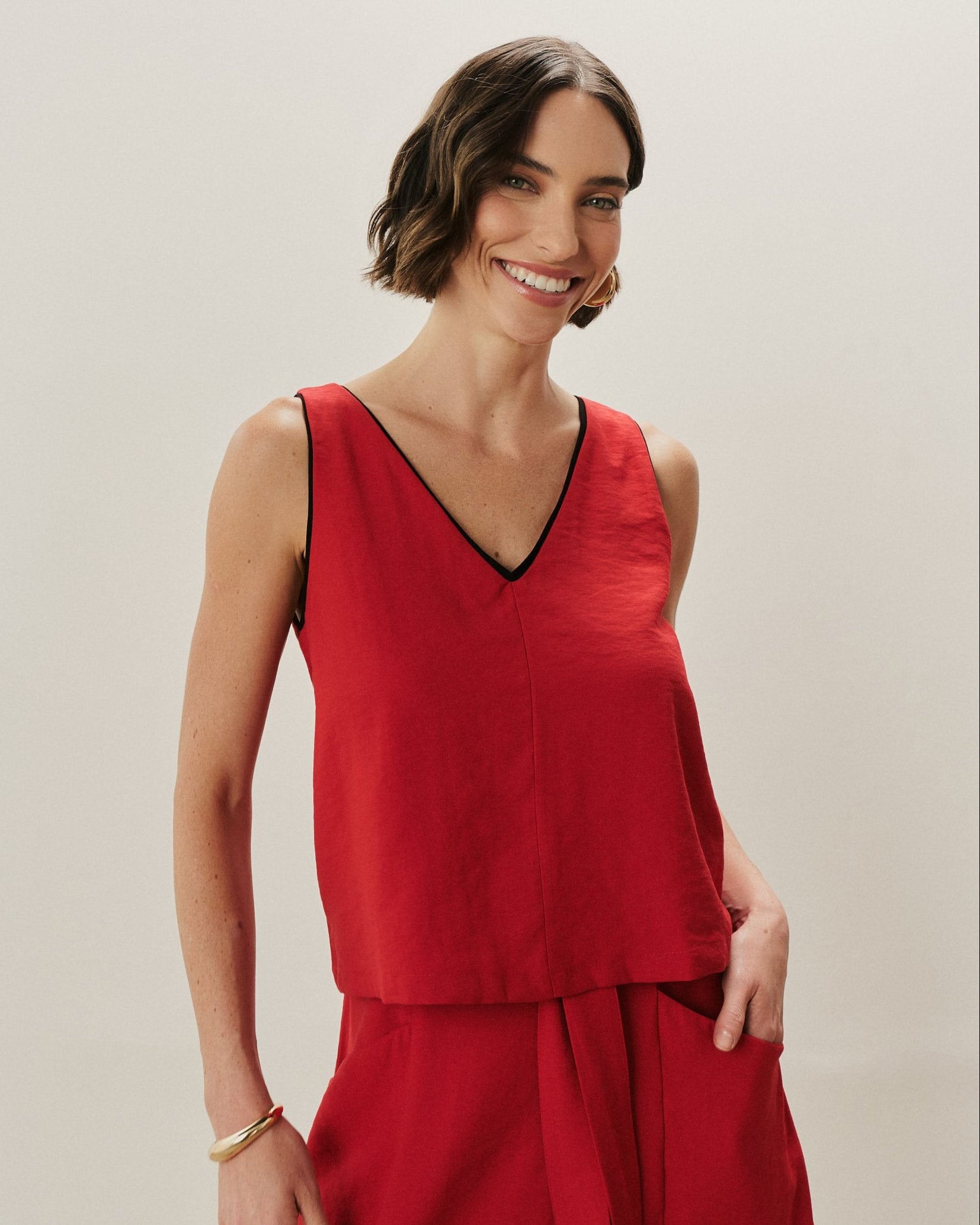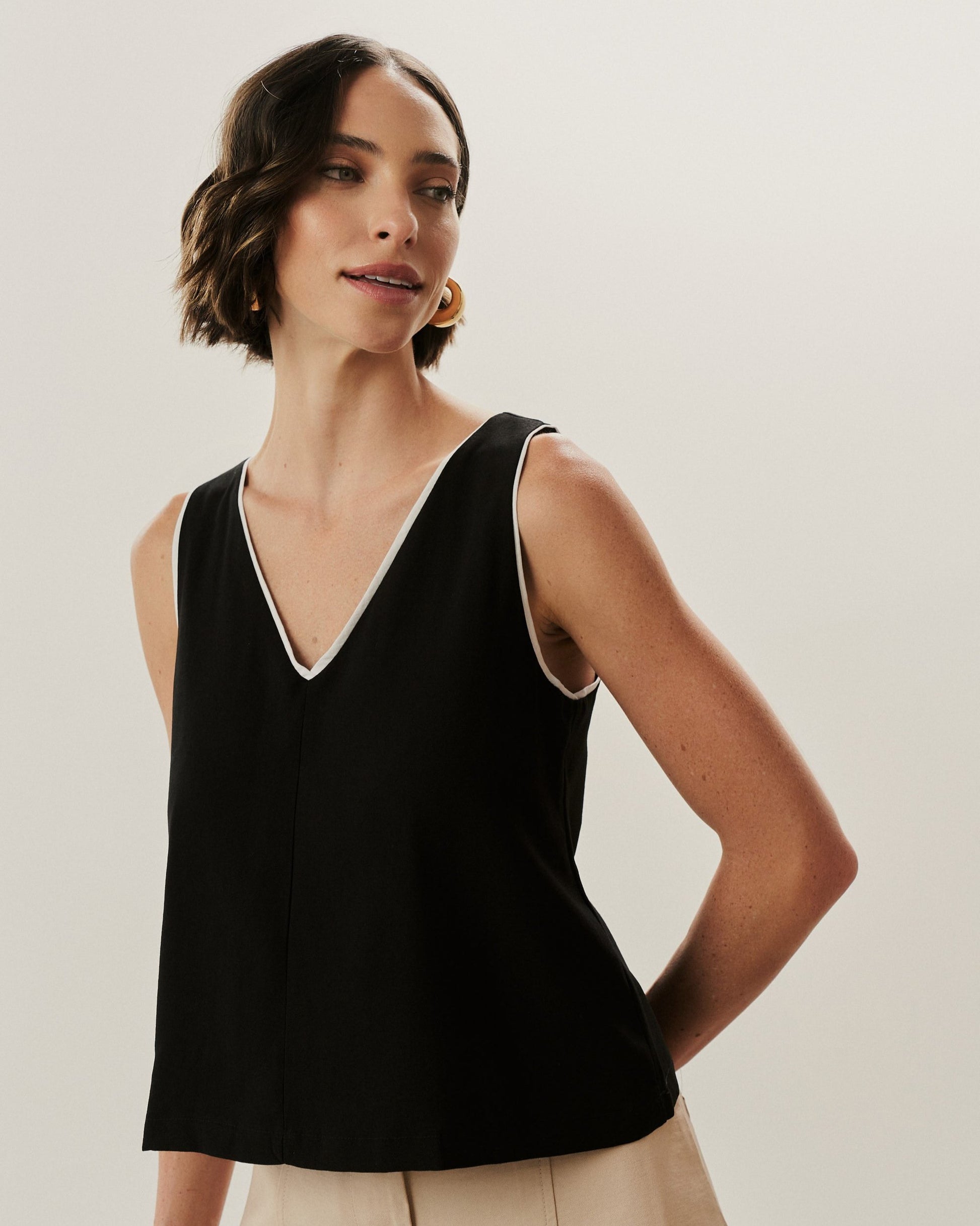 Regata de alça larga com decote V e detalhes com contraste de cor nas bordas. É a peça mais trend do momento, aquele básico com toque fashionista que você precisa ter!