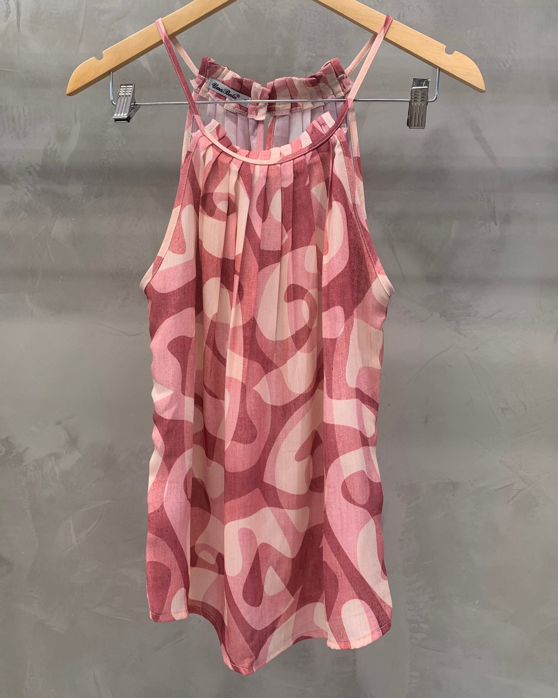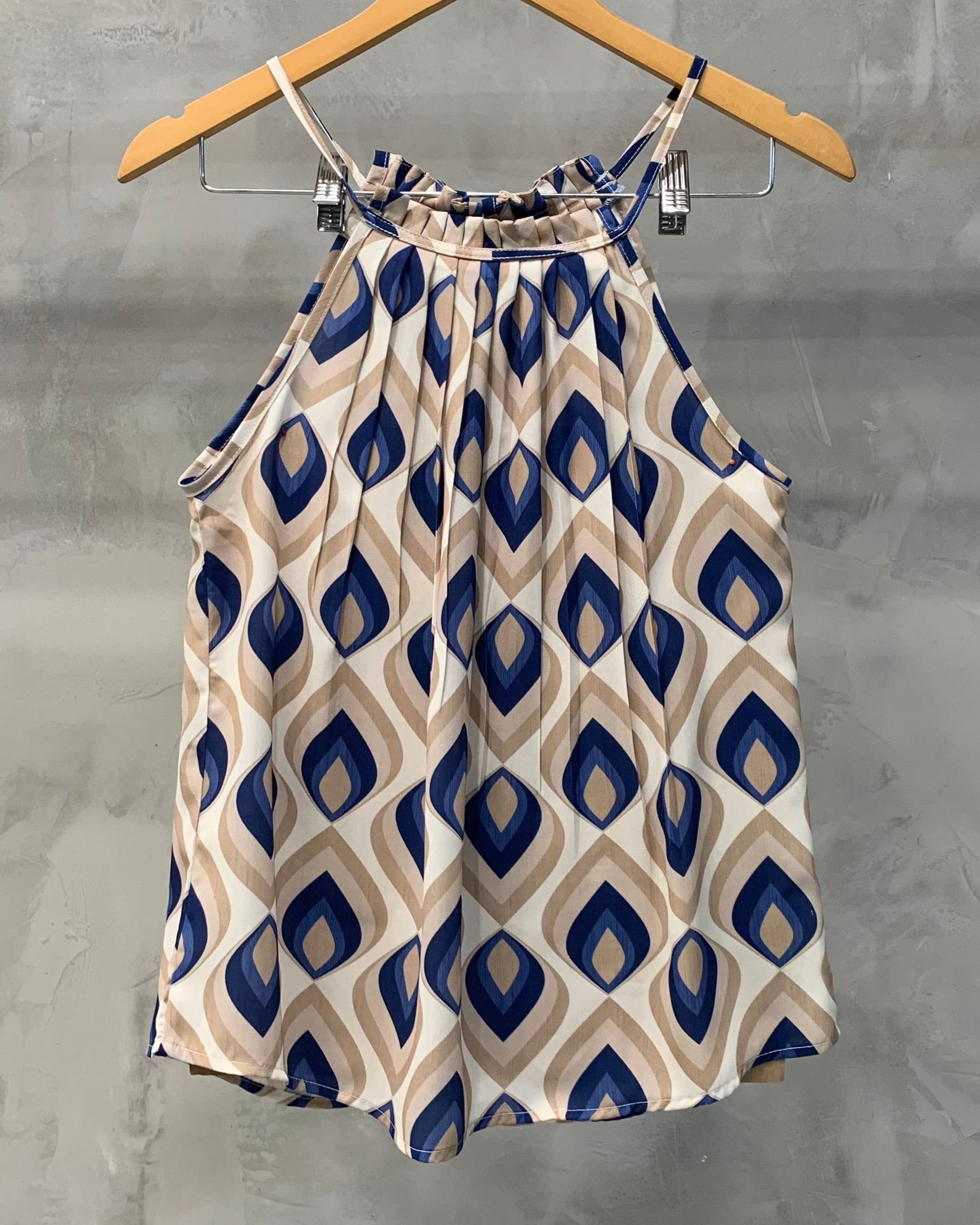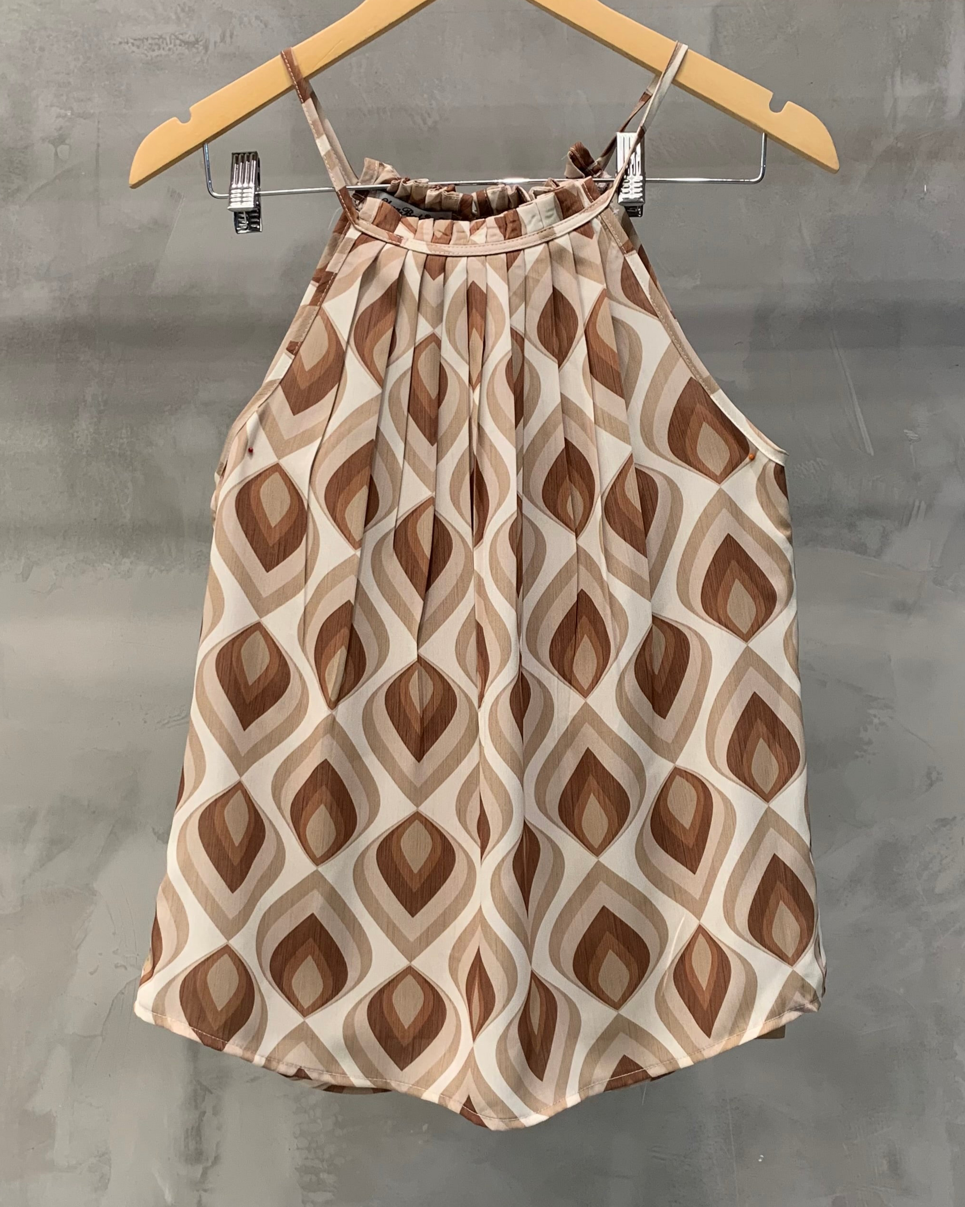 Regata modelagem trapézio alça fina, decote redondo, pregas na gola, comprimento médio normal.