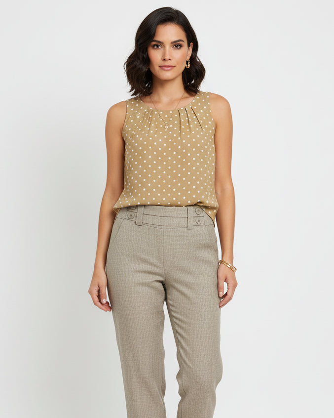 Regata de poá de alça larga e pregas no busto. Um básico perfeito para o dia a dia