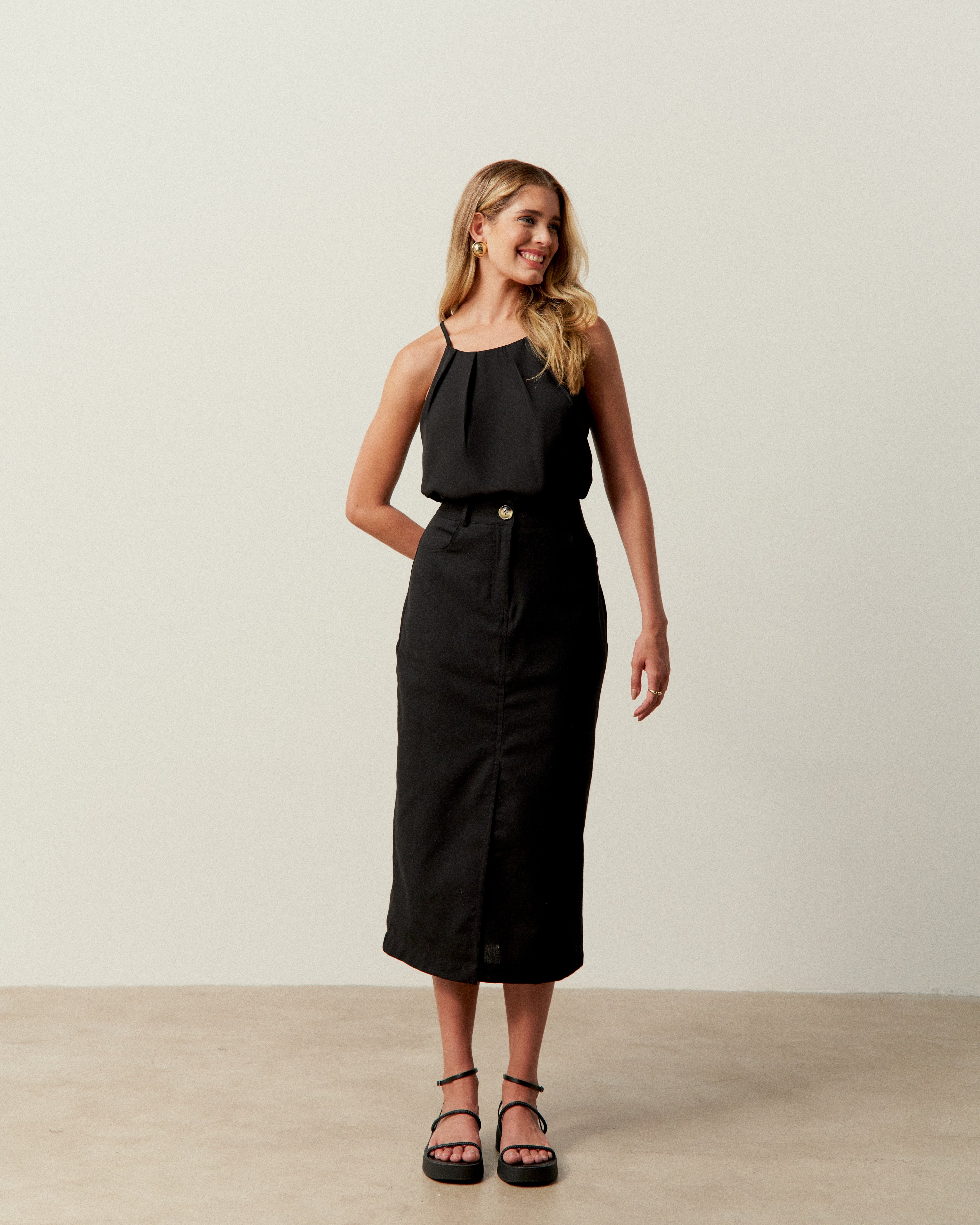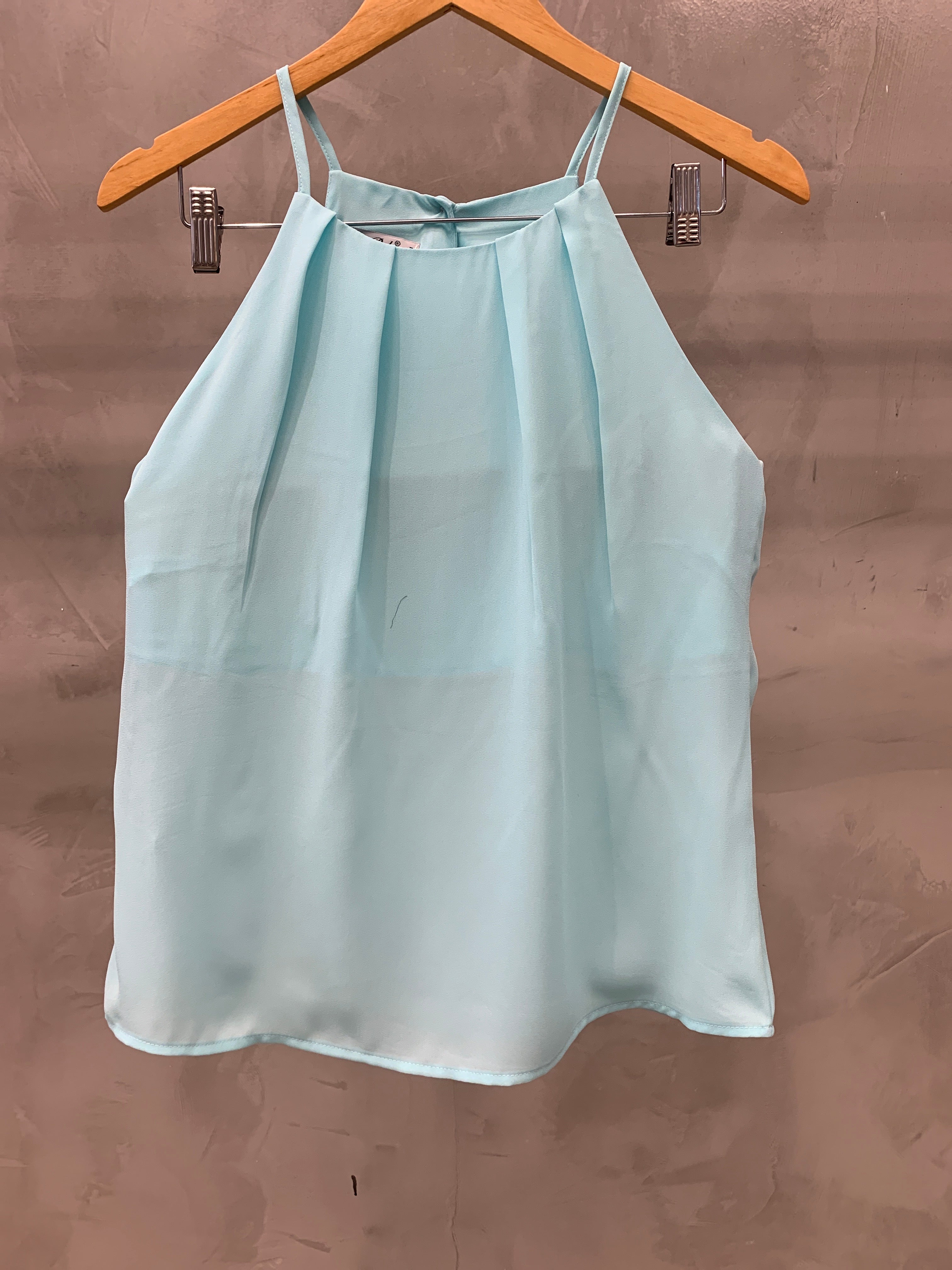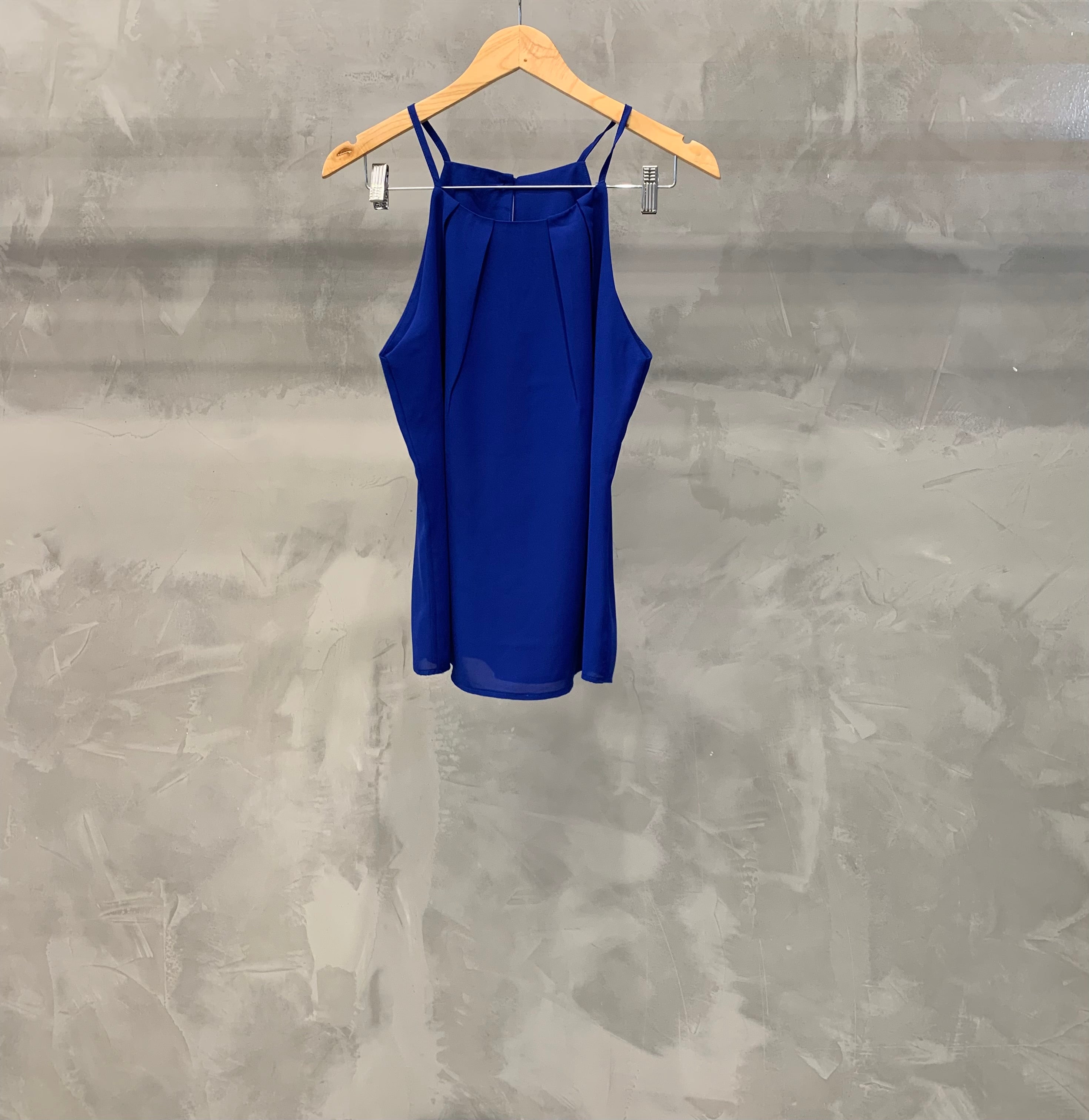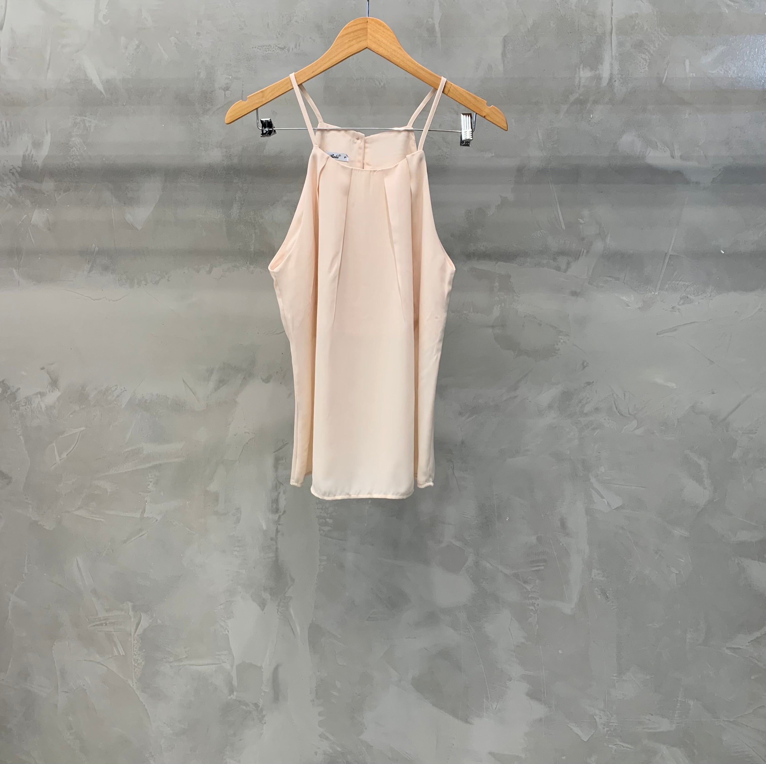 Regata lisa com fecho de botão traseiro e detalhes de pregas no busto. A peça tem modelagem solta, podendo ser usadas em diversas ocasiões.