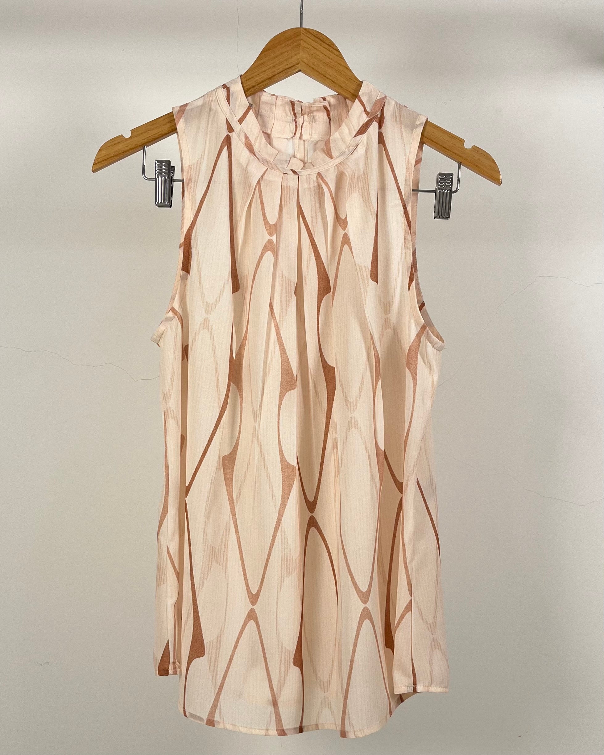 Regata Plus size estampada, solta, com alça larga e botão traseiro. Tem detalhe de dobras e pregas na gola, que dá um ar moderno na peça.