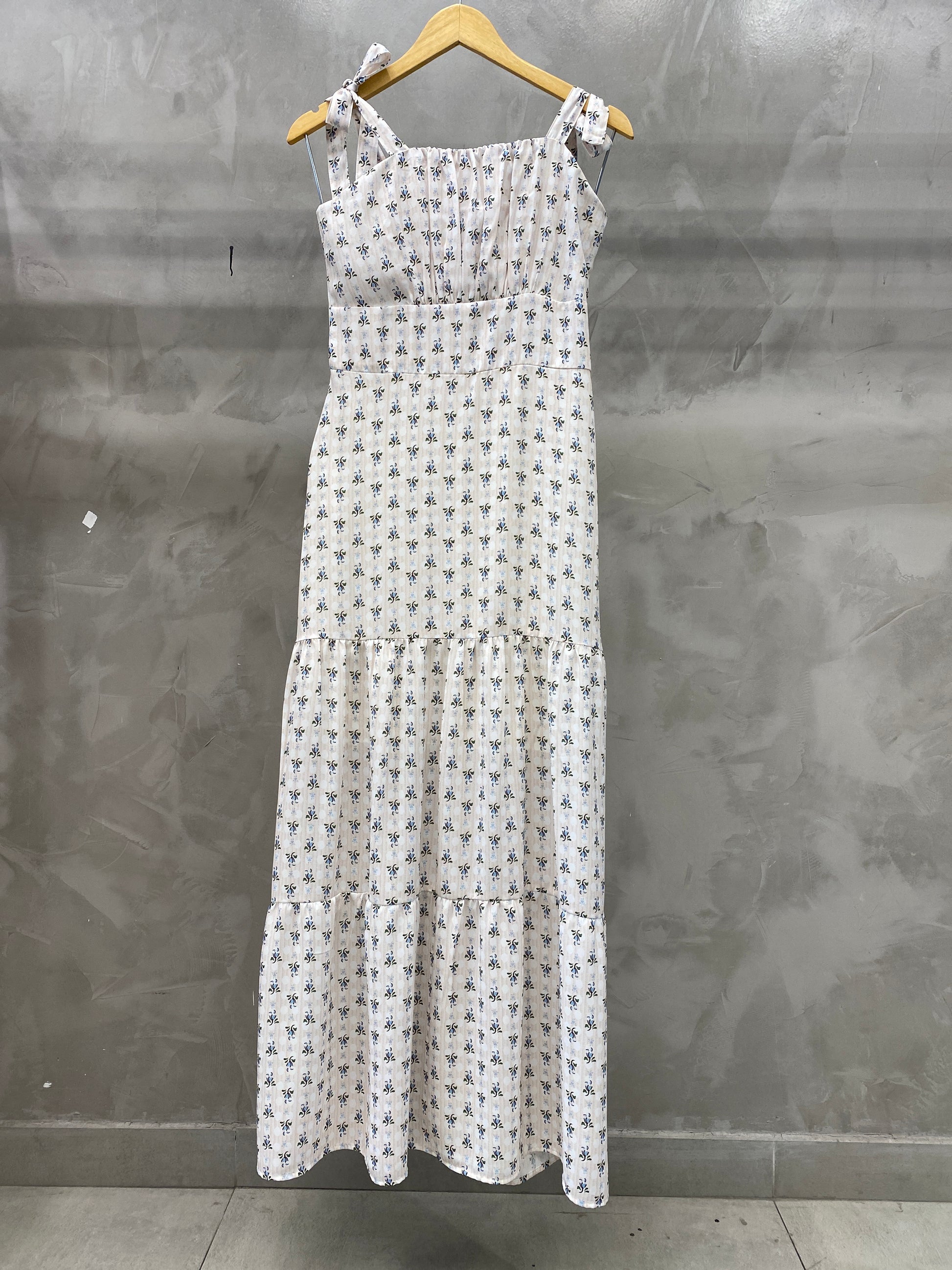 Vestido longo com alças de amarração, decote reto e estampa delicada. Modelagem fluida com recortes e caimento leve, perfeito para compor looks frescos e charmosos nos dias quentes.