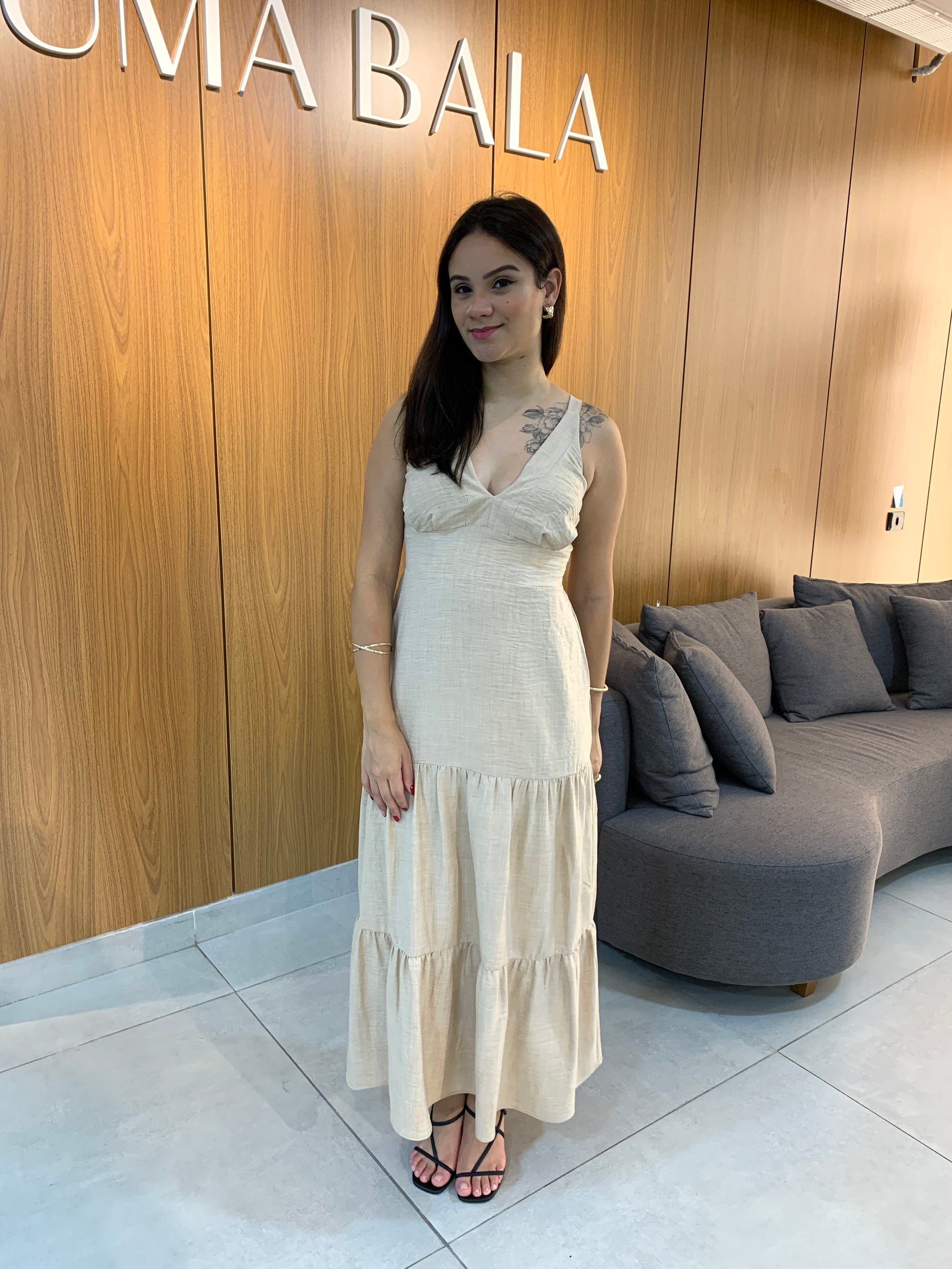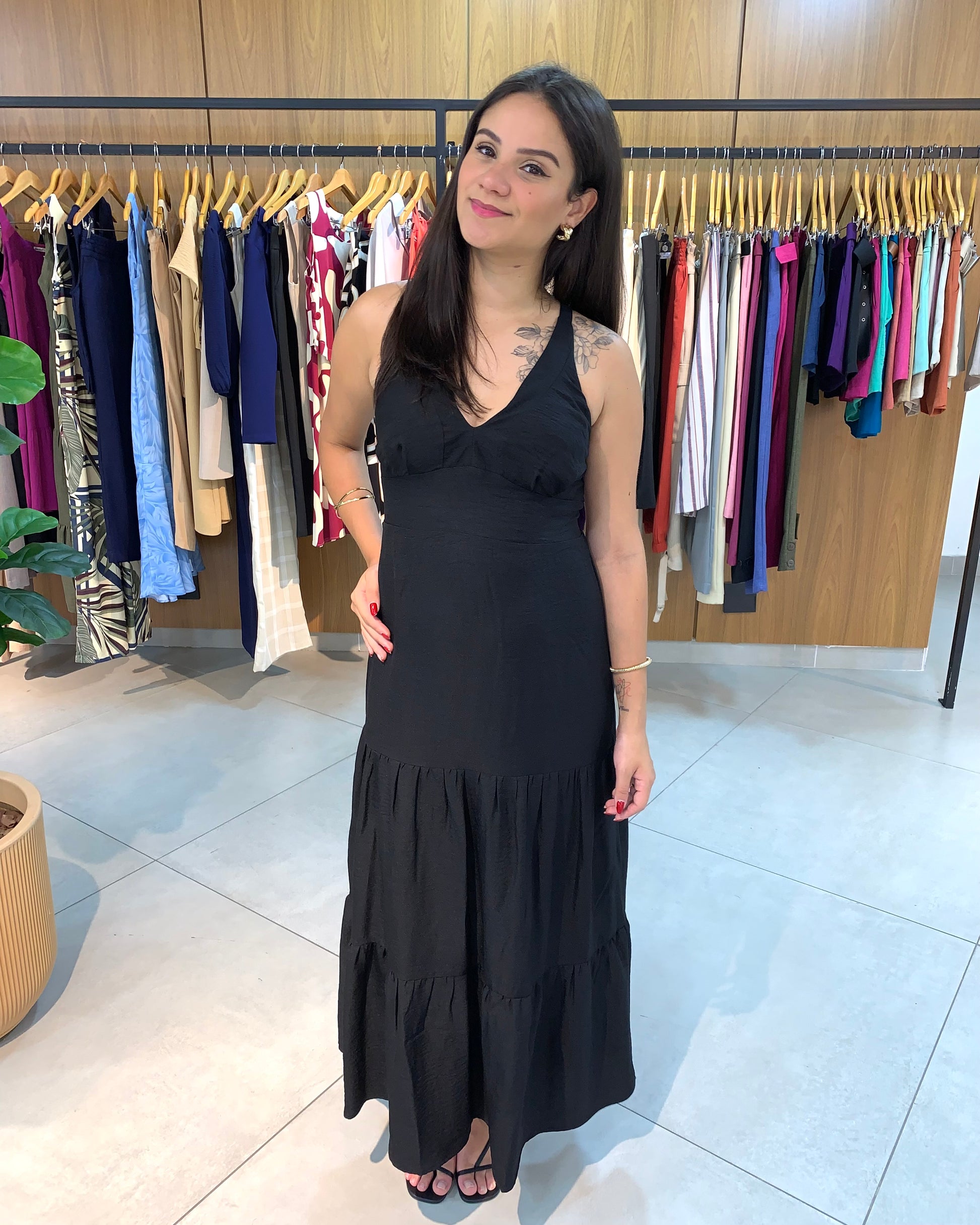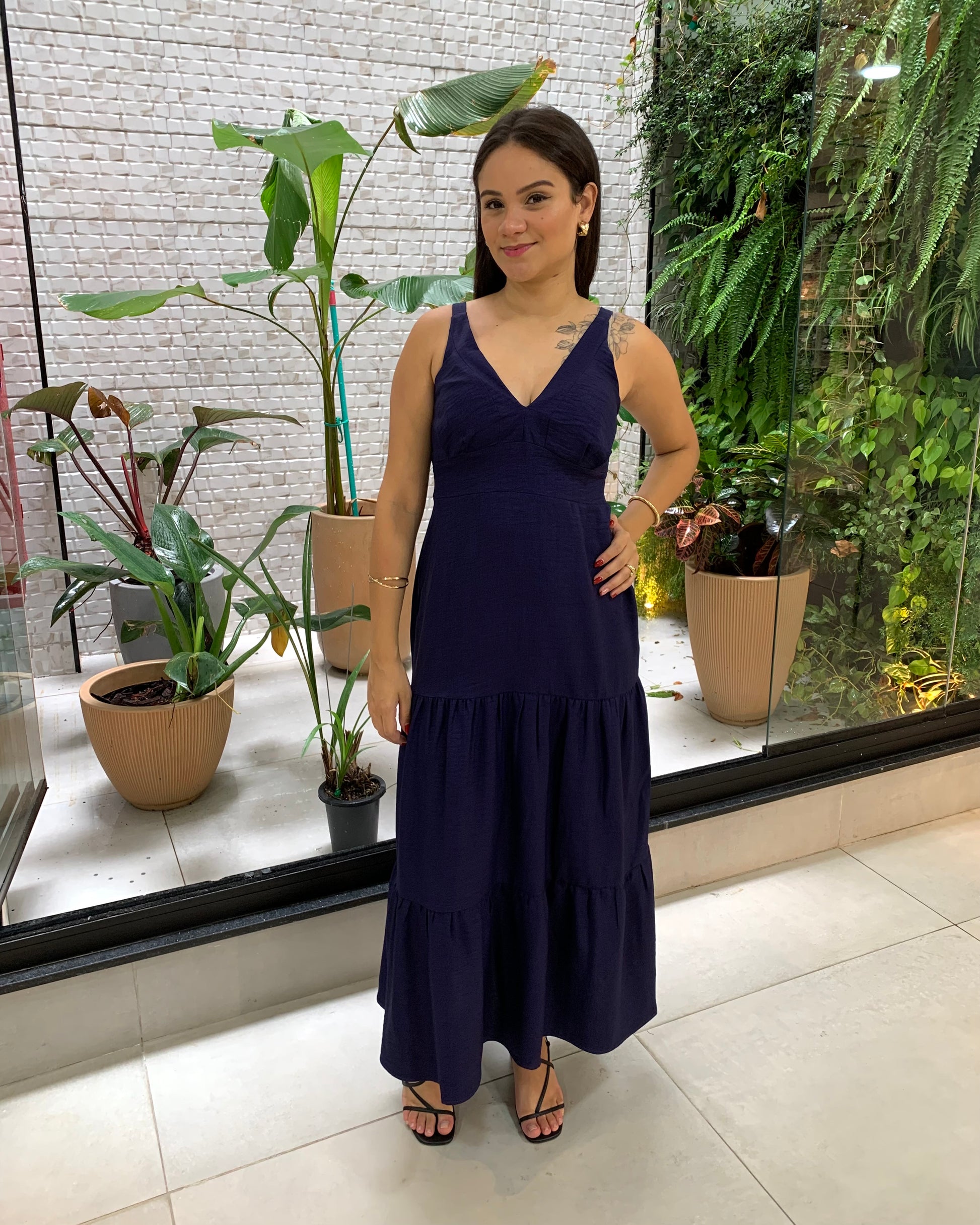 Vestido liso longo de alça grossa com regulador, decote V, elástico traseiro, tem detalhes de pregas no busto e babados na barra. Uma peça confortável e romântica! Perfeito para o verão que está ai !