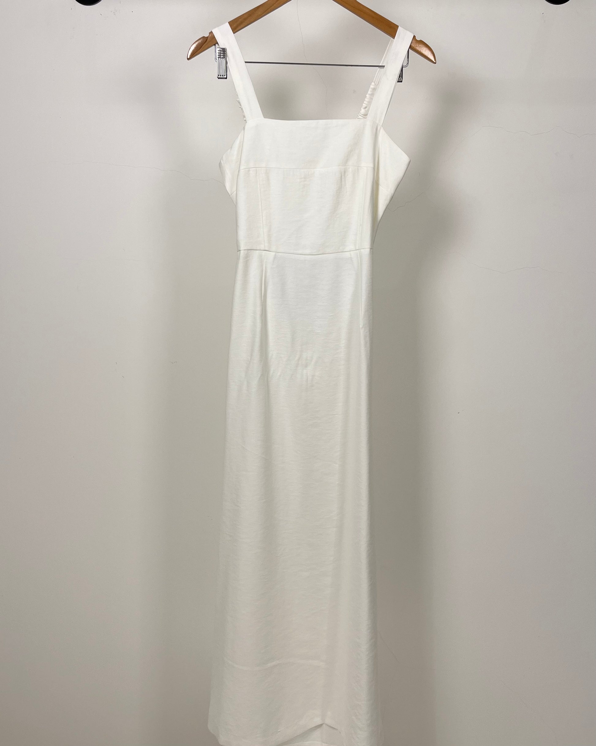 Vestido longo liso com decote reto, alças largas e acinturado. Uma peça simples mas com toda elegância e conforto. Tem elástico nas alças e zíper traseiro para mais fácil vestimenta. Confeccionado no tecido Marante, possui forro.