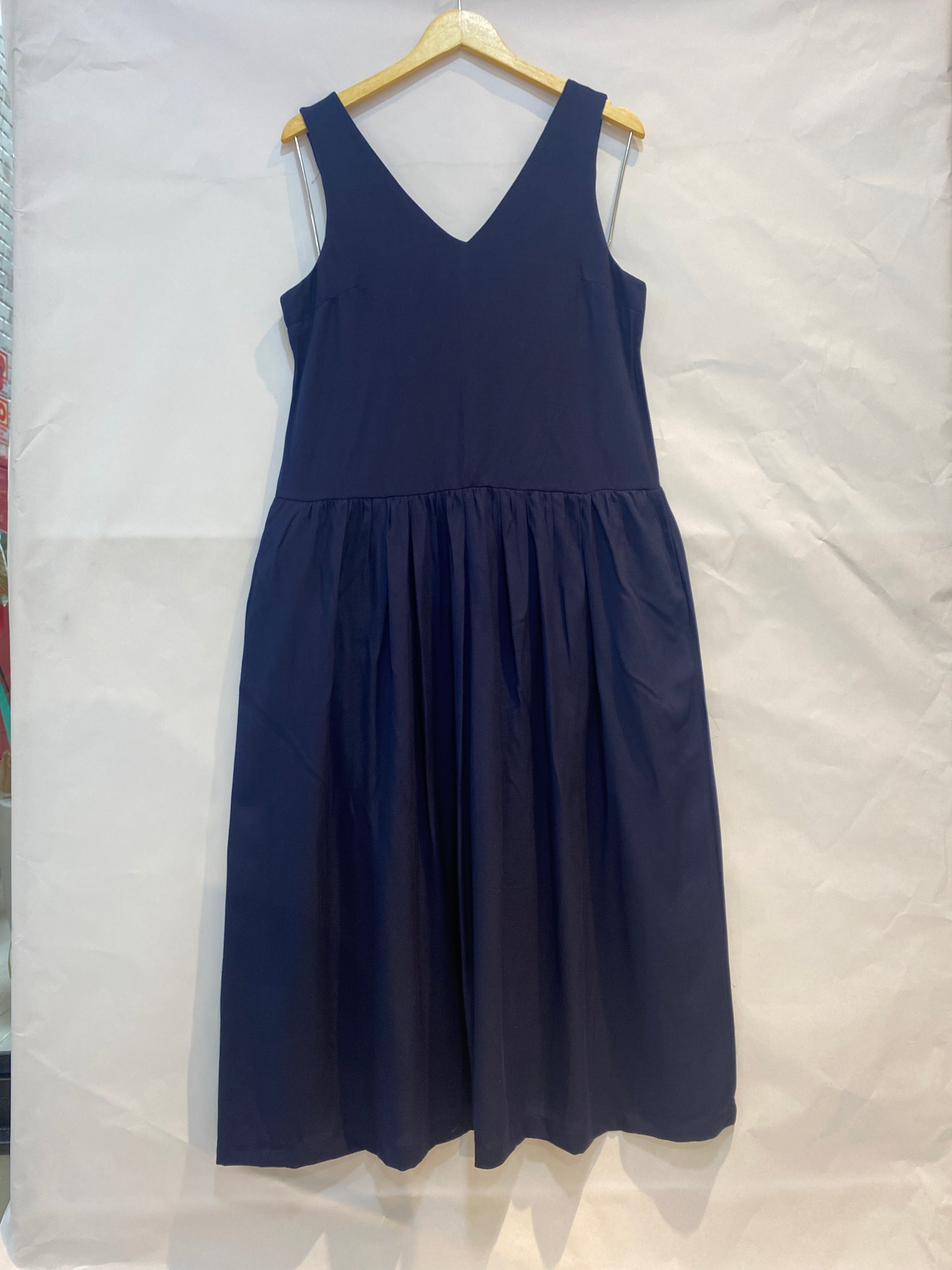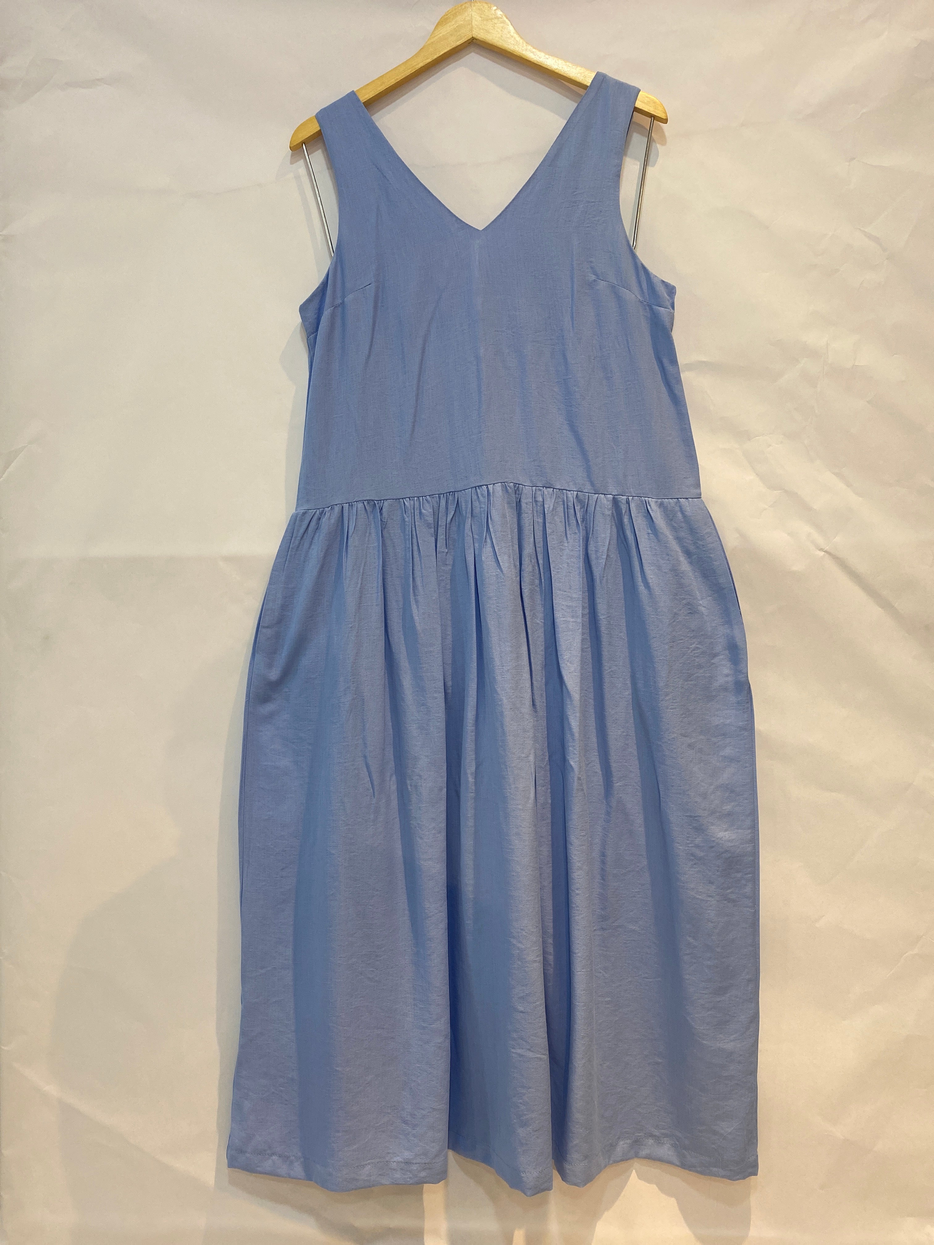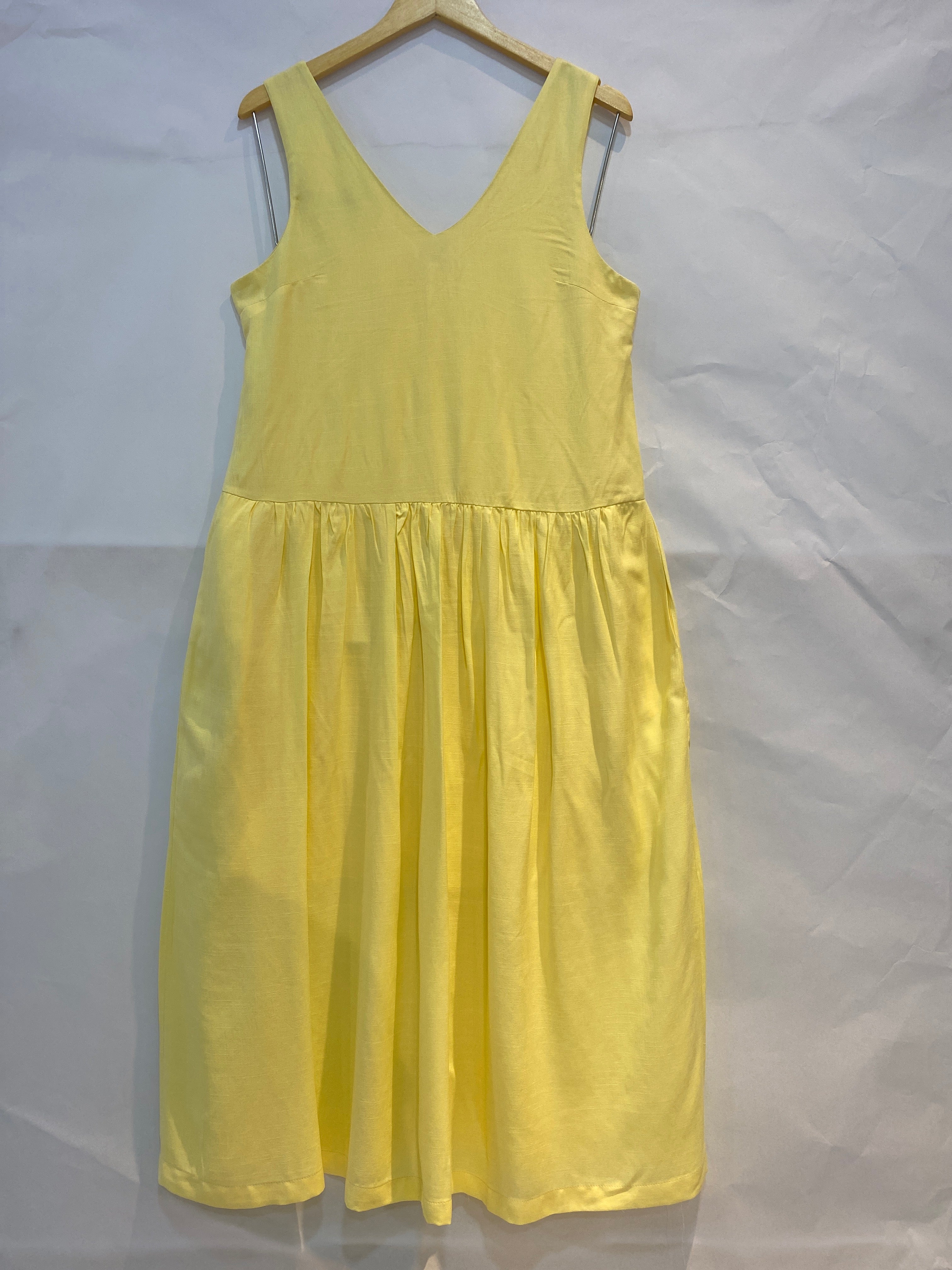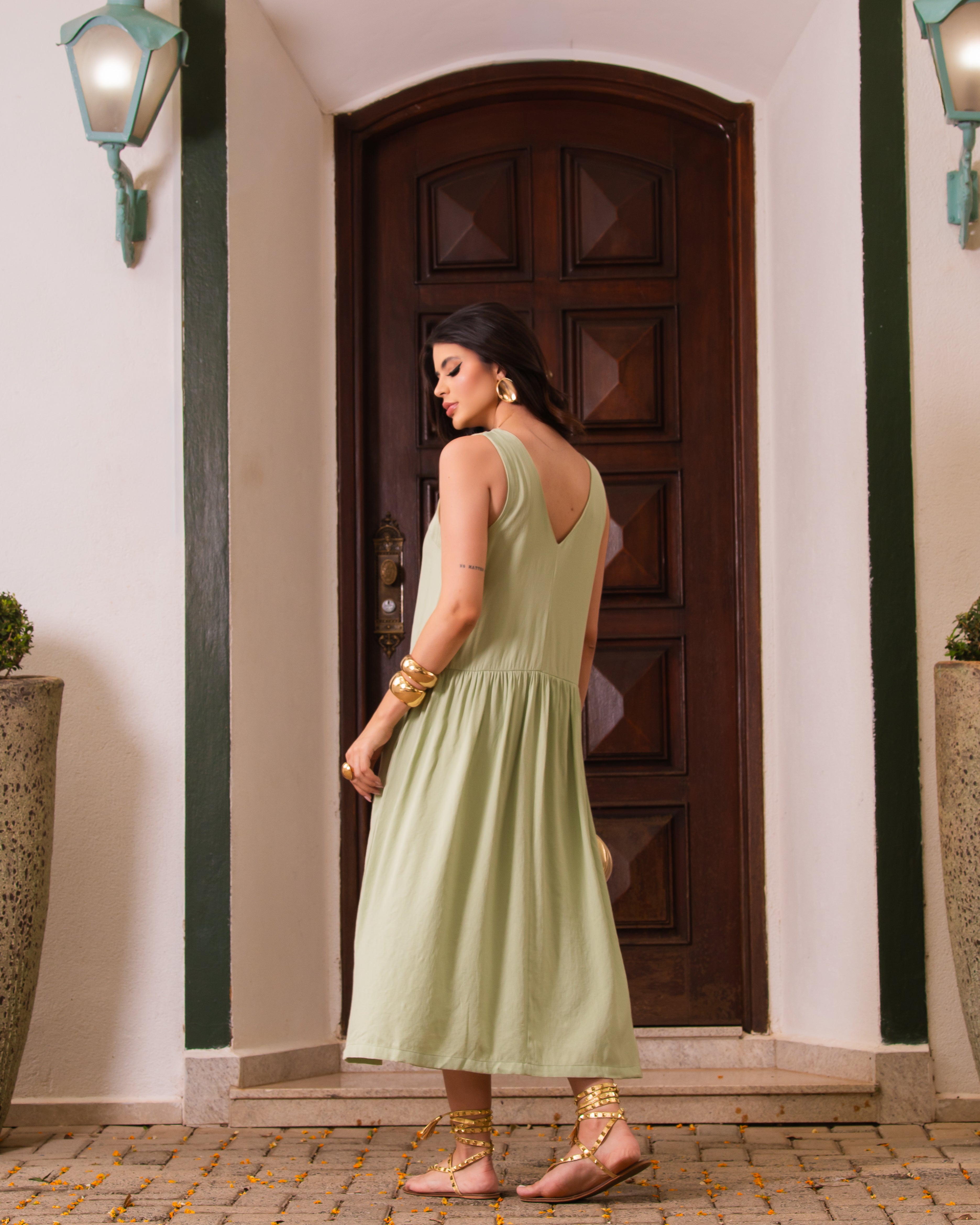 Vestido Midi liso com decote V e alças largas, saia aberta em A com bolsos laterais. É confeccionado no tecido de viscolinho e possui forro.