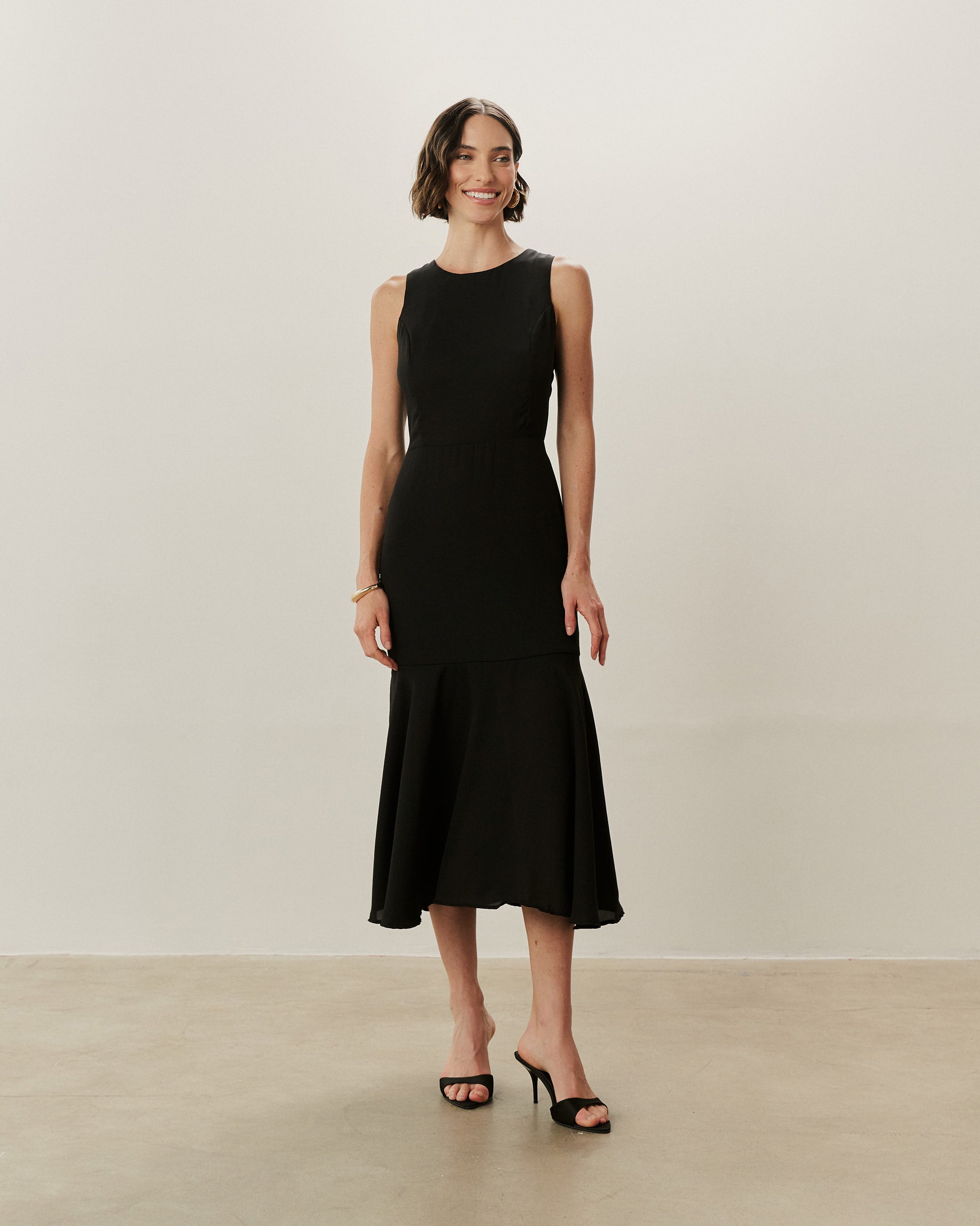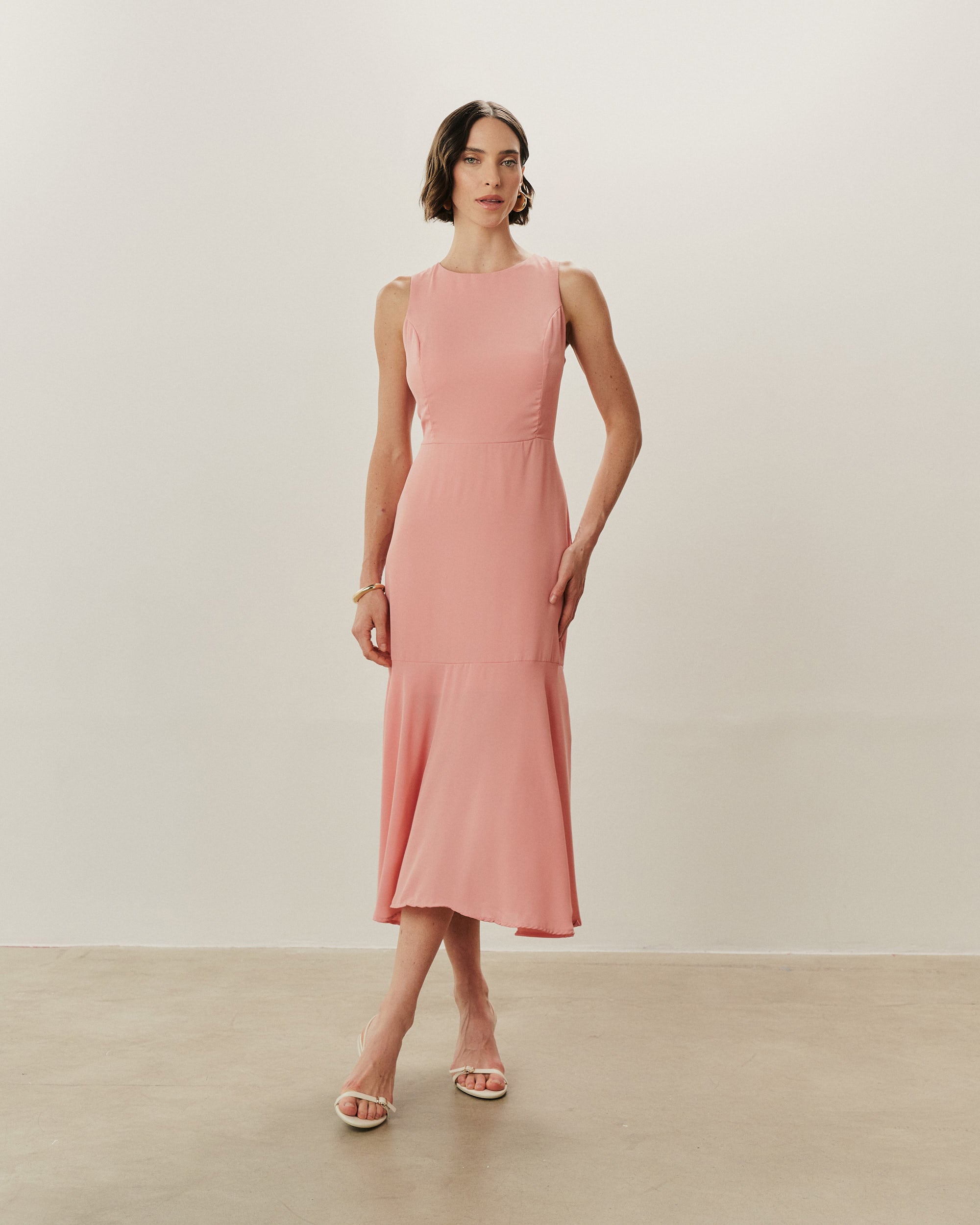 Vestido midi liso, de alças largas e acinturado. Tem um babado na barra que dá um ar romântico a peça e zíper traseiro. Possui forro.
