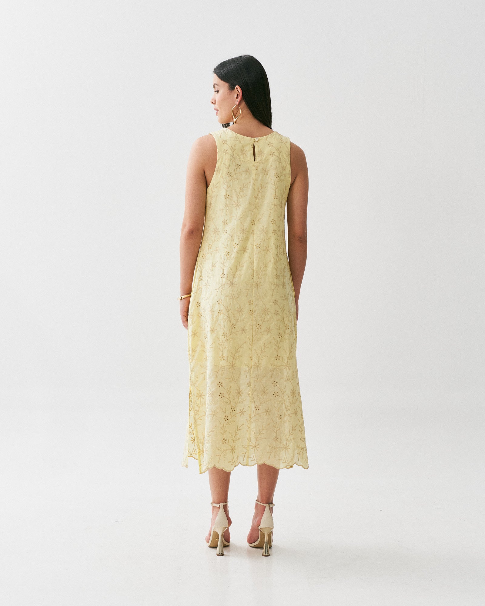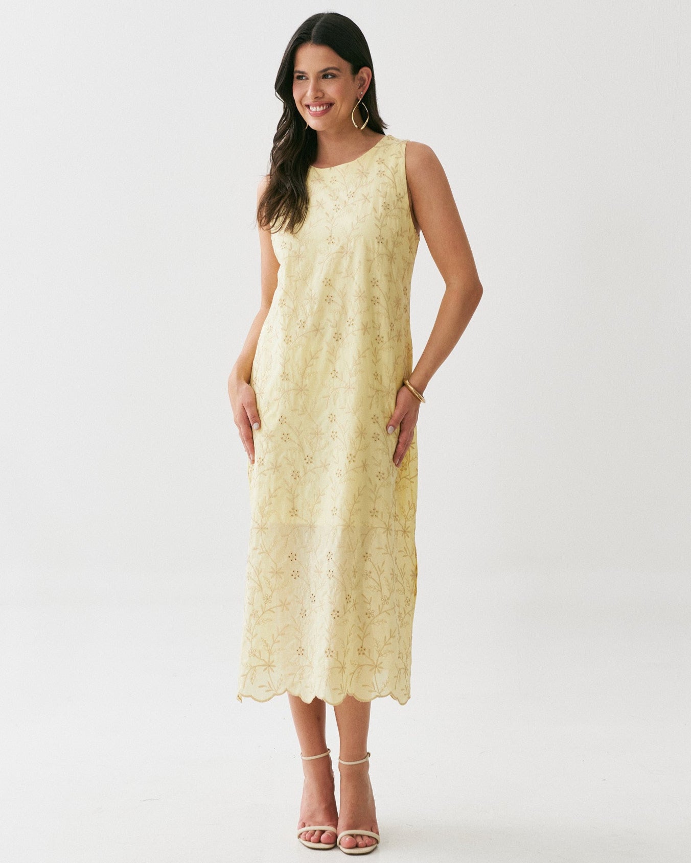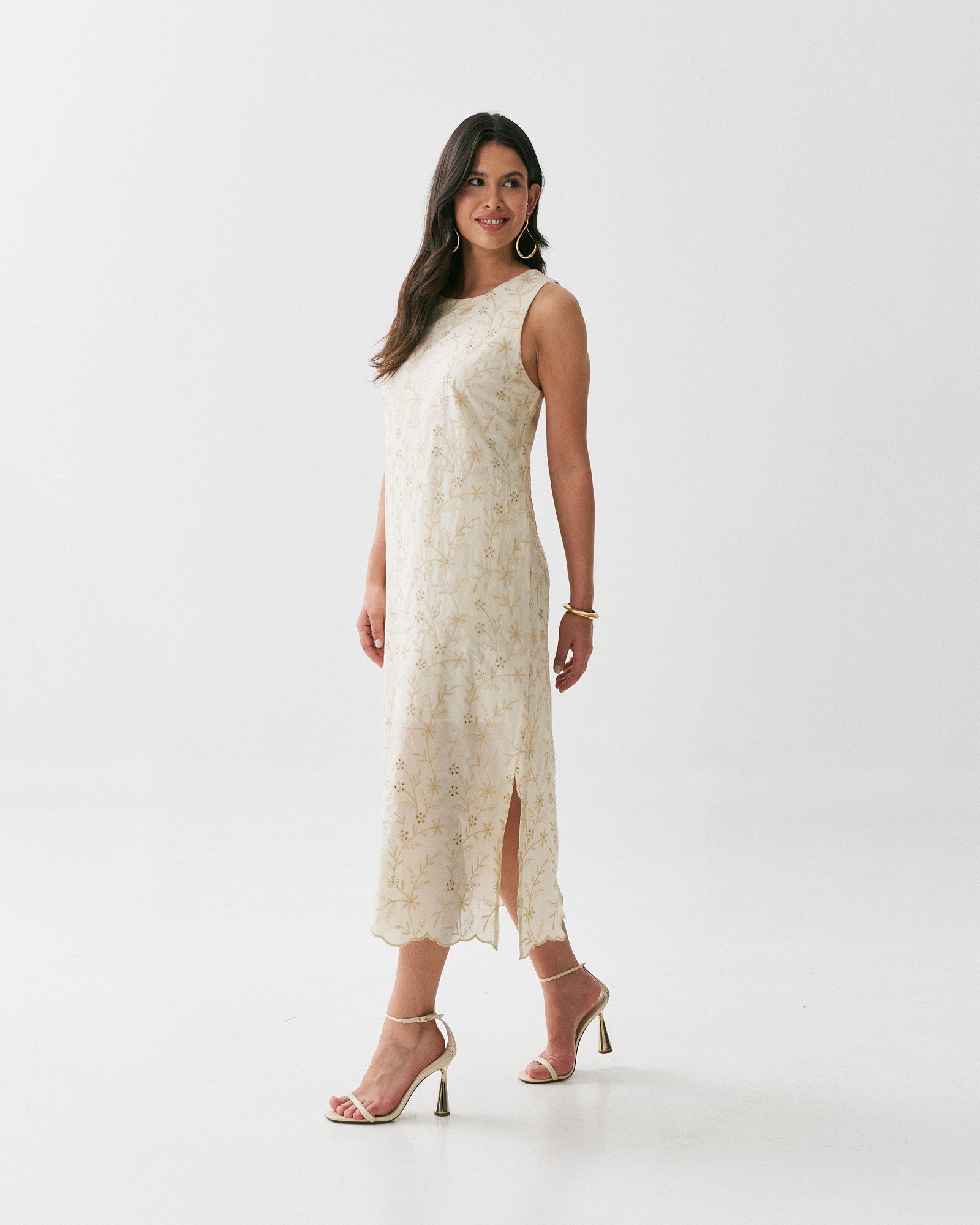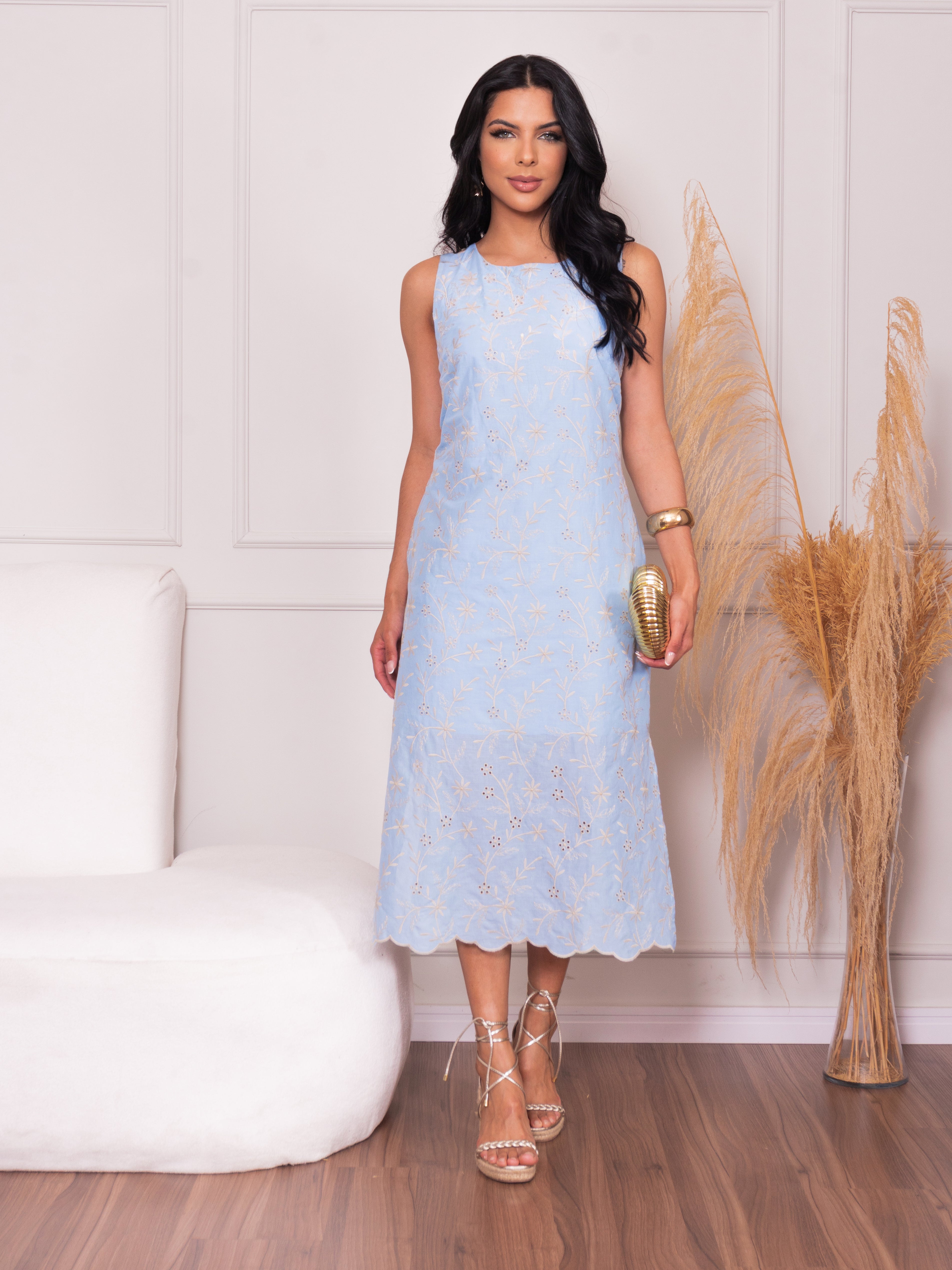 Vestido Midi Laise com modelagem reta e solta, tem aberturas na lateral para maior conforto durante o uso. É confeccionado no tecido 100% Algodão e possui forro.