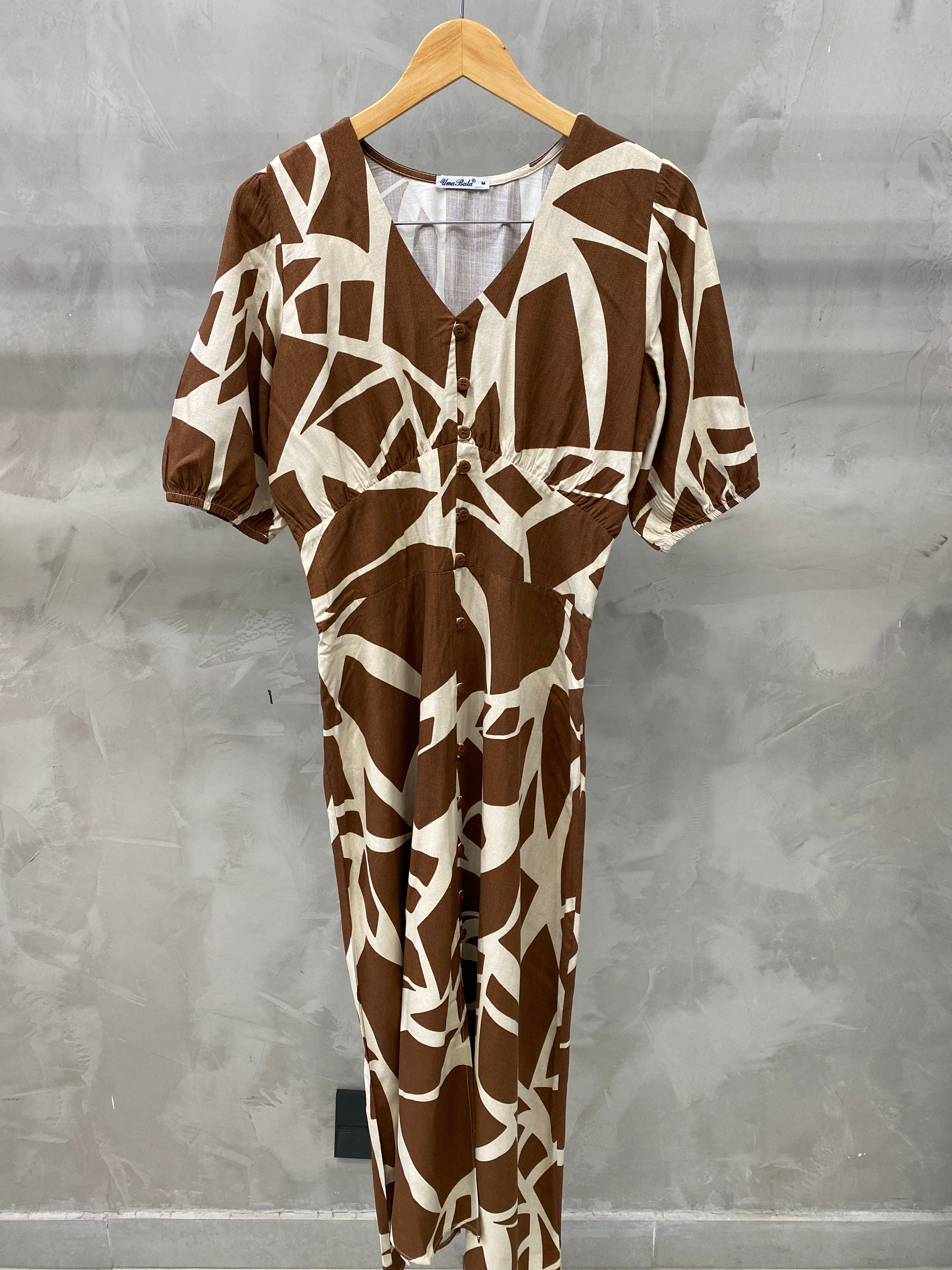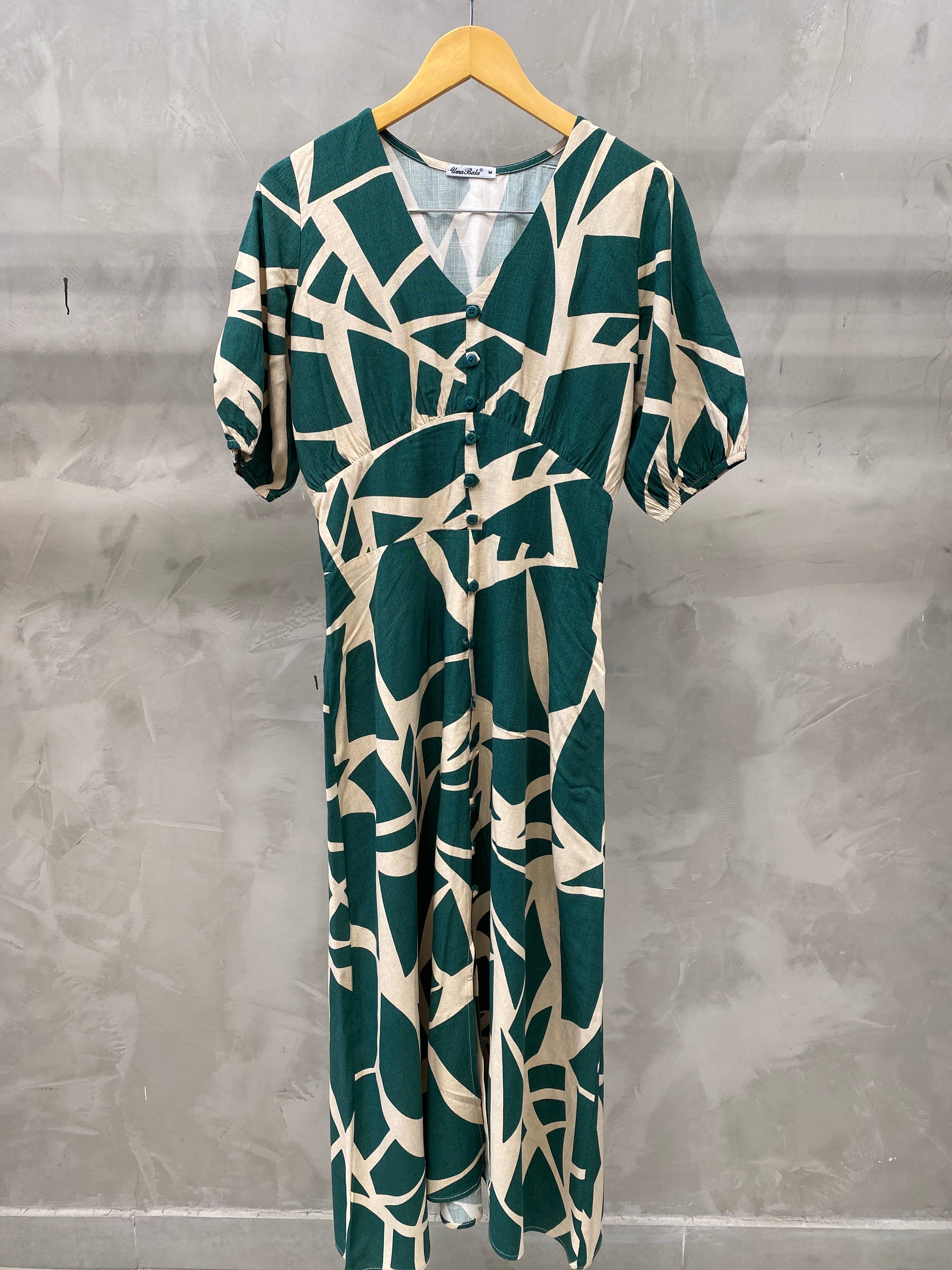 Vestido longo estampado com modelagem acinturada e evasê, tem detalhes de manga bufante com botões frontais. É confeccionado no tecido de Viscose, leve e fresco.