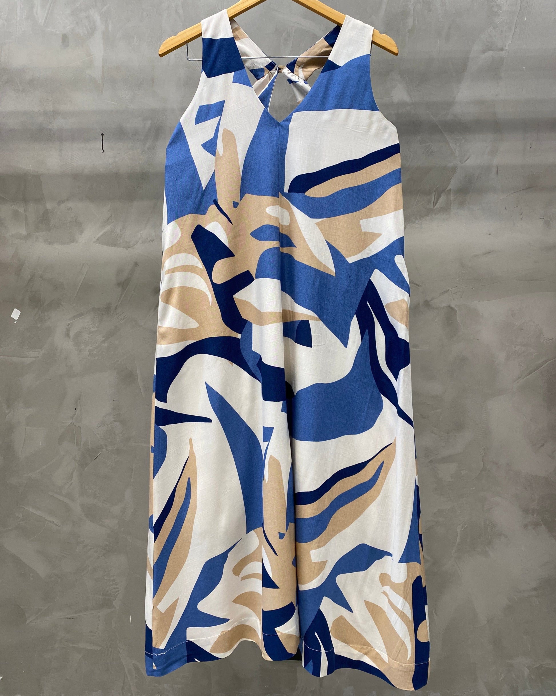Vestido Midi Estampado com decote V, alças largas e modelagem soltinha em A. Tem um botão traseiro para mais fácil vestimenta e possui forro. É confeccionado no tecido de Viscose, aquele tecido leve com muito frescor.