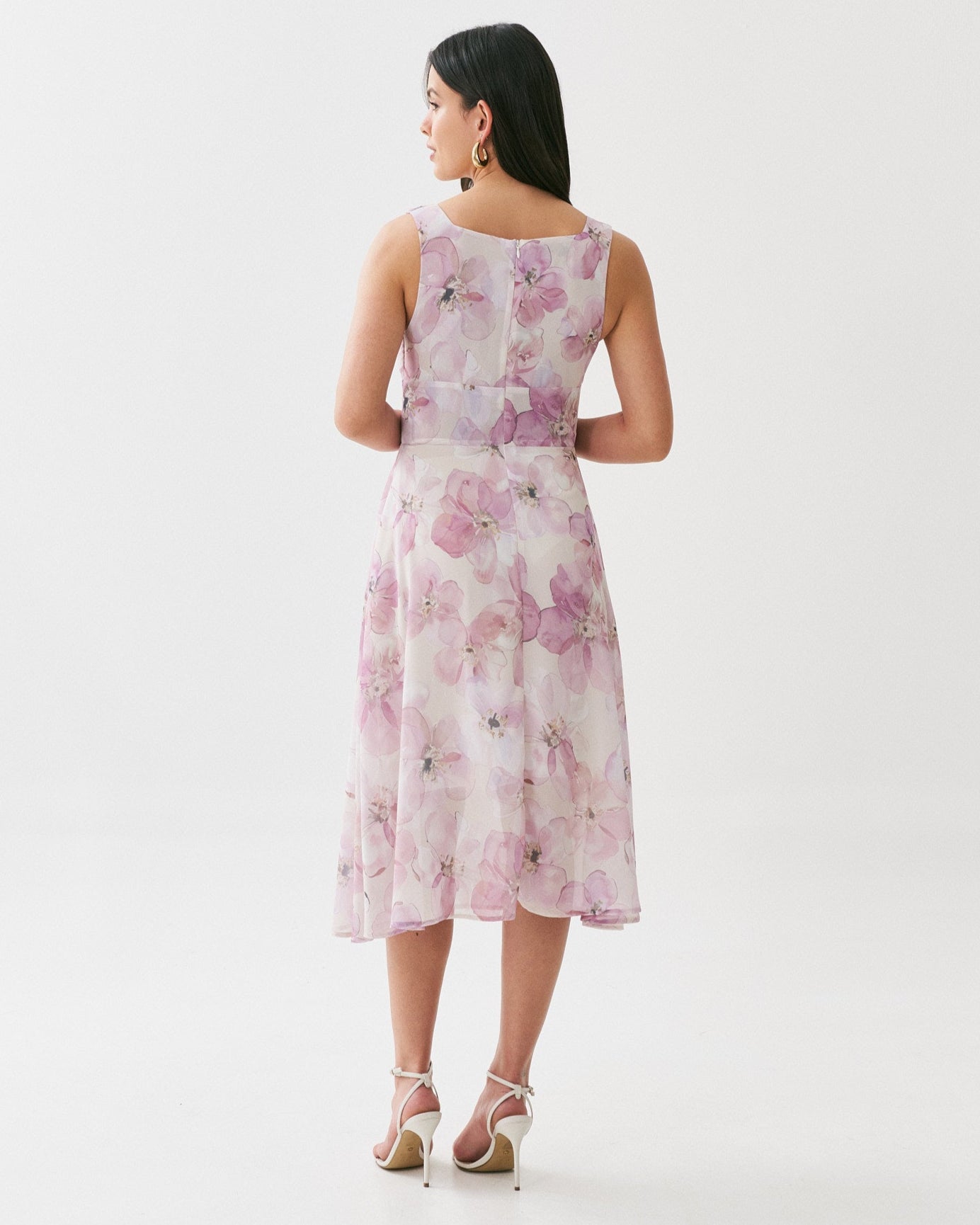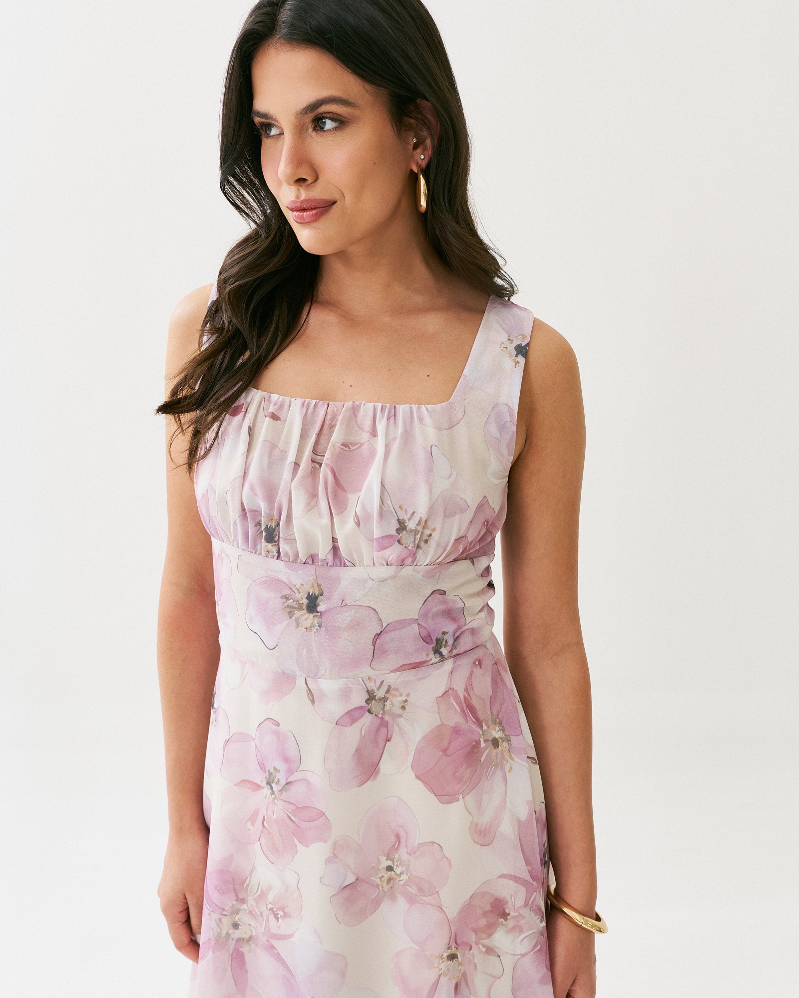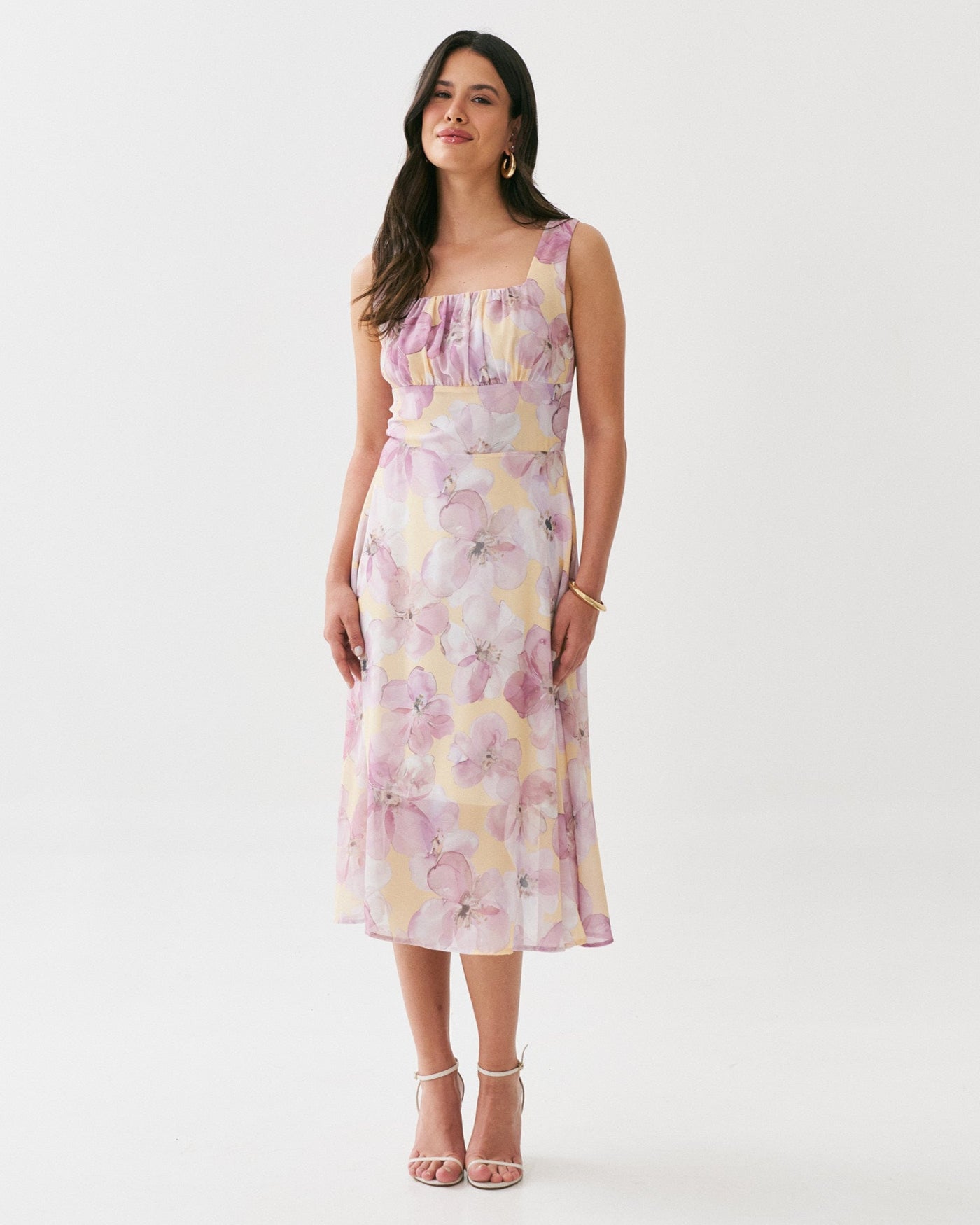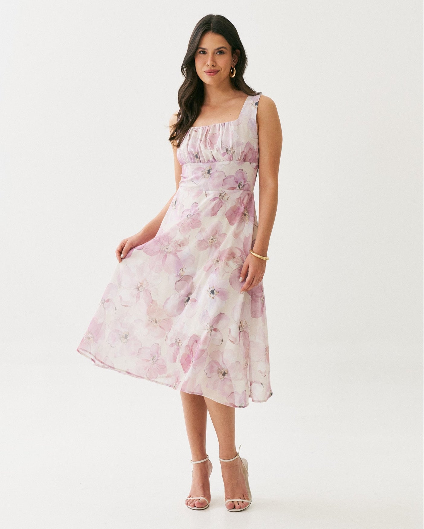 Vestido midi estampada de alças largas, modelagem acinturada com saia em A. Tem franzidos na parte do busto e zíper traseiro. É confeccionado no tecido de chiffon estampado e possui forro.
