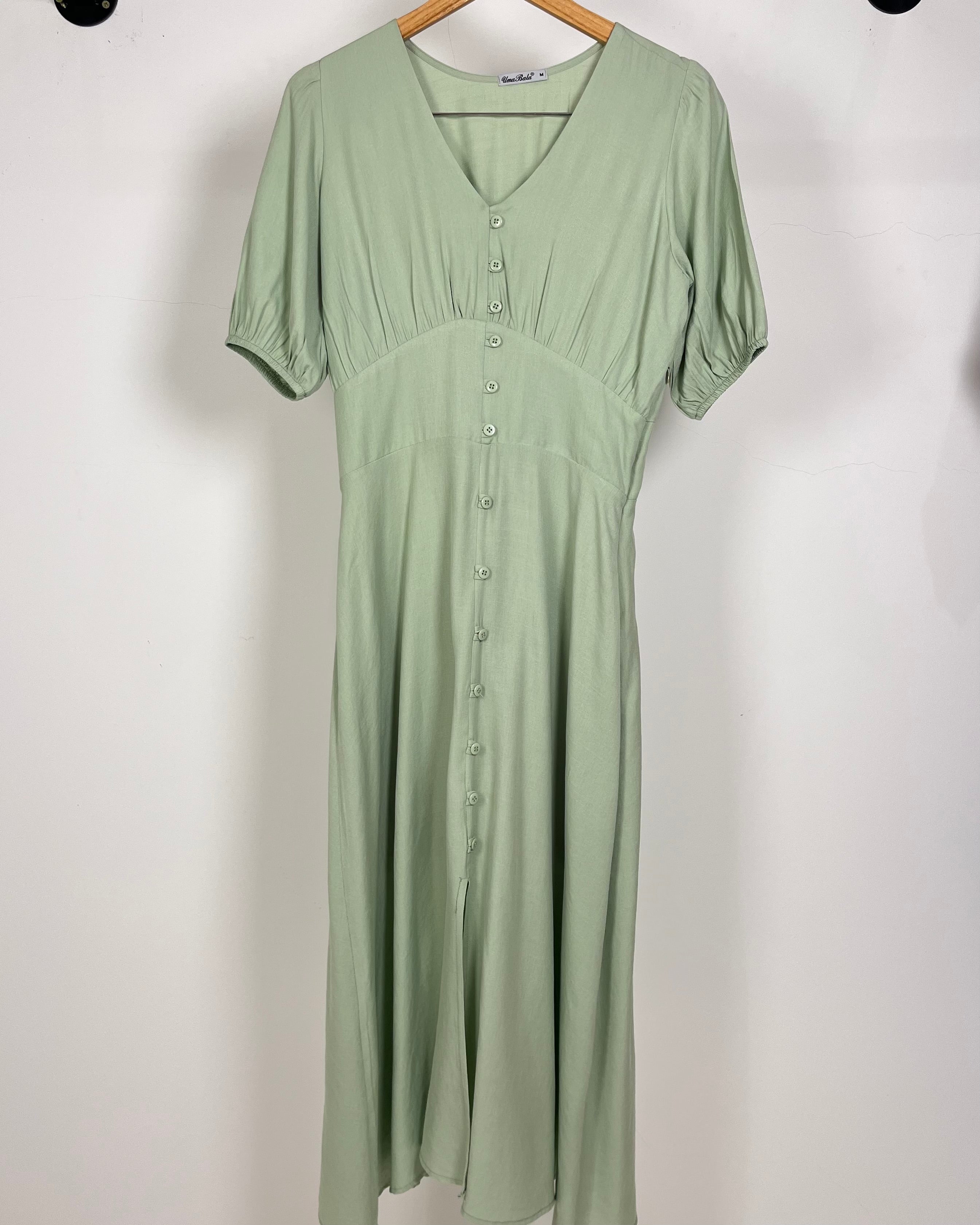Vestido midi estampado com modelagem acinturada e evasê, tem detalhes de manga bufante com botões frontais. É confeccionado no tecido de Viscose, leve e fresco.