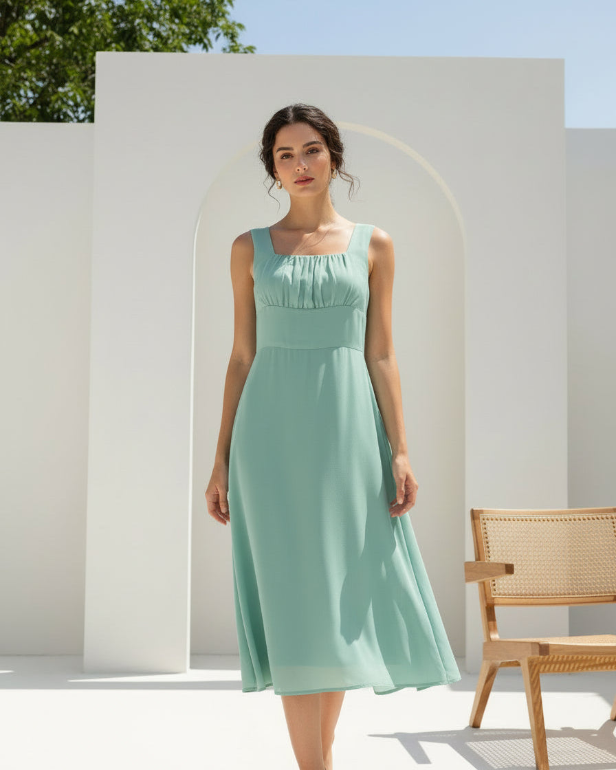 Vestido midi liso de alças largas, modelagem acinturada com saia em A. Tem franzidos na parte do busto e zíper traseiro. É confeccionado no tecido de chiffon estampado e possui forro.