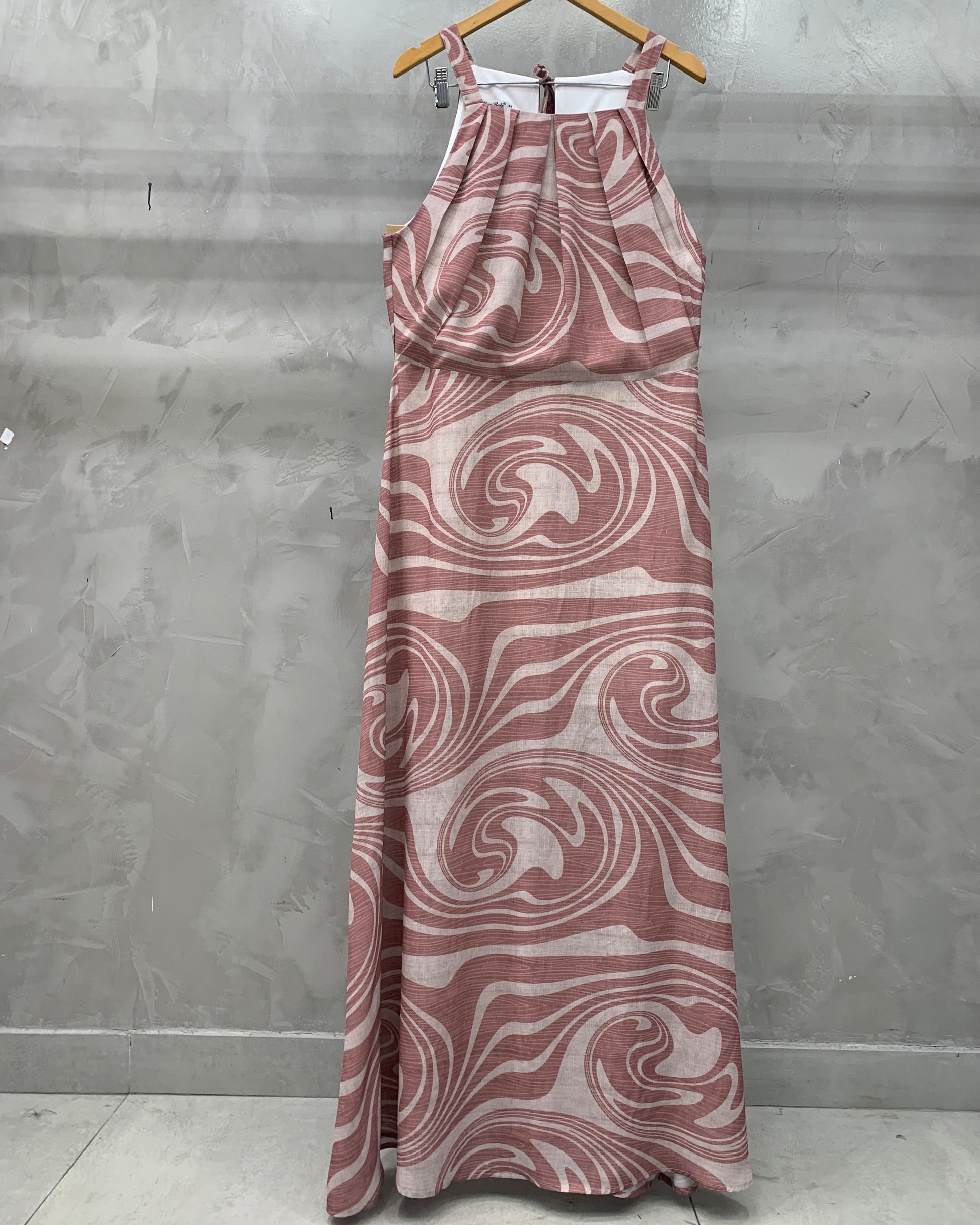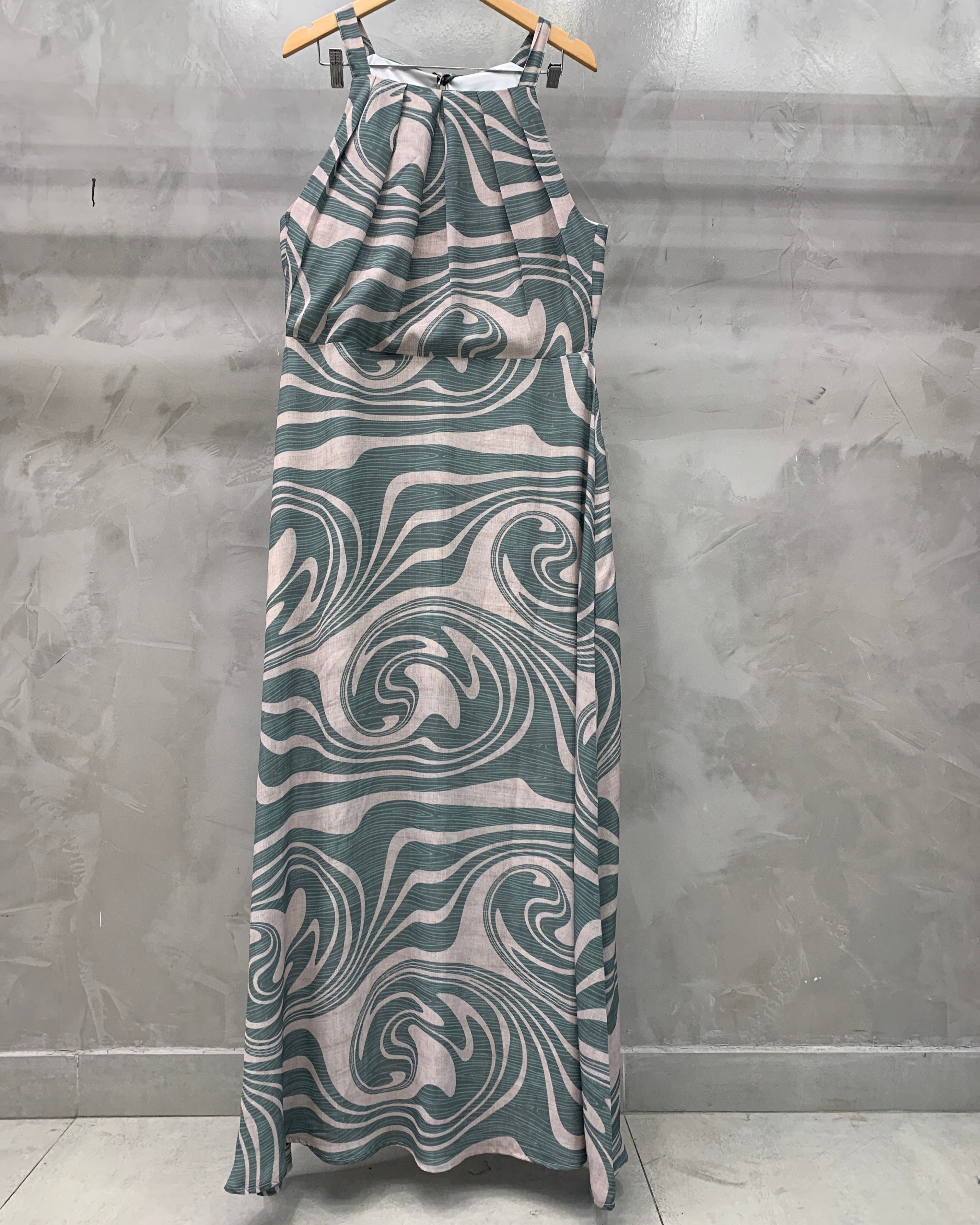 Vestido longo estampado com pregas na gola, alça grossa, amarração e zíper na parte traseira | Composição: 100% Poliéster