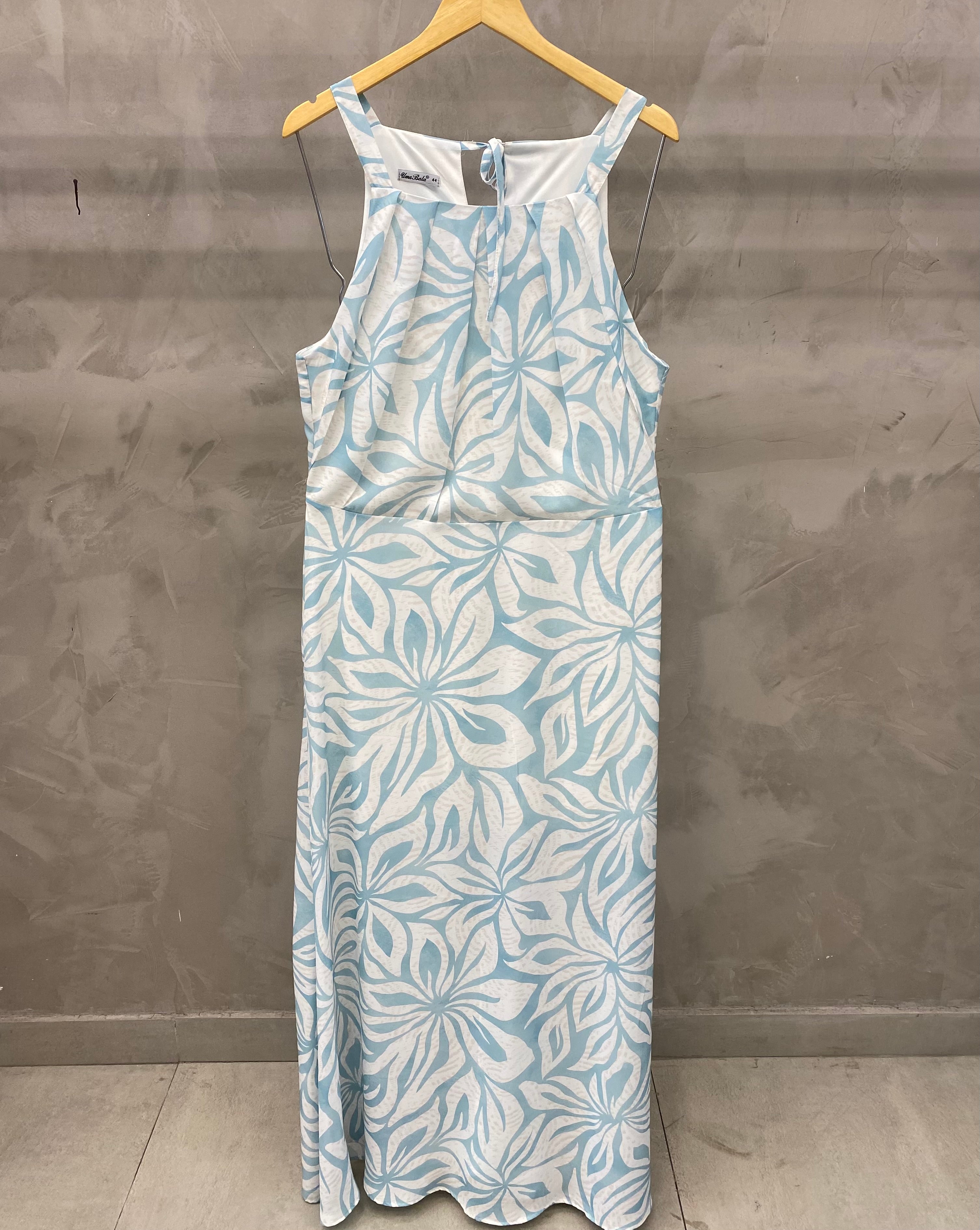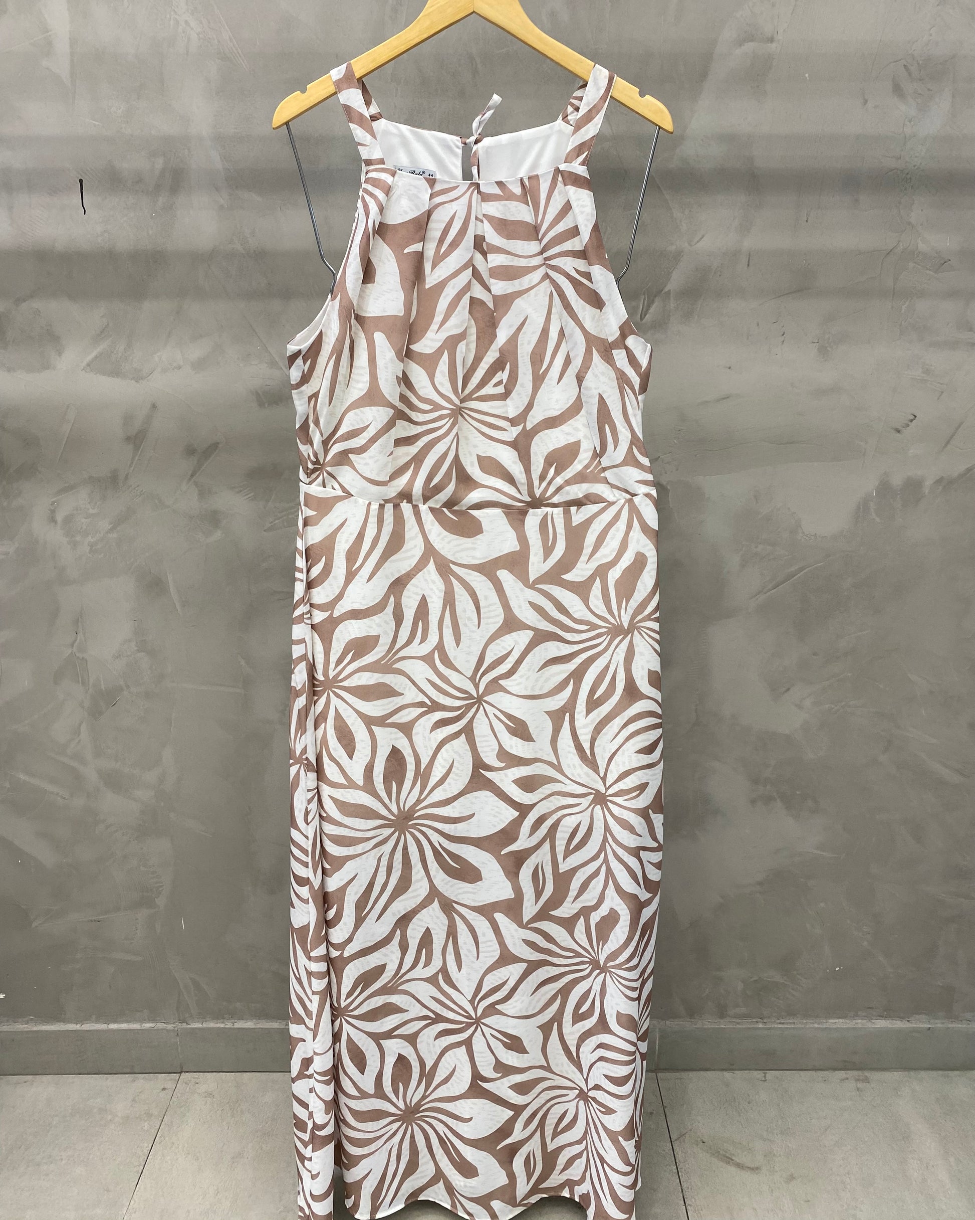 Vestido longo estampado com pregas na gola, alça grossa, amarração e zíper na parte traseira