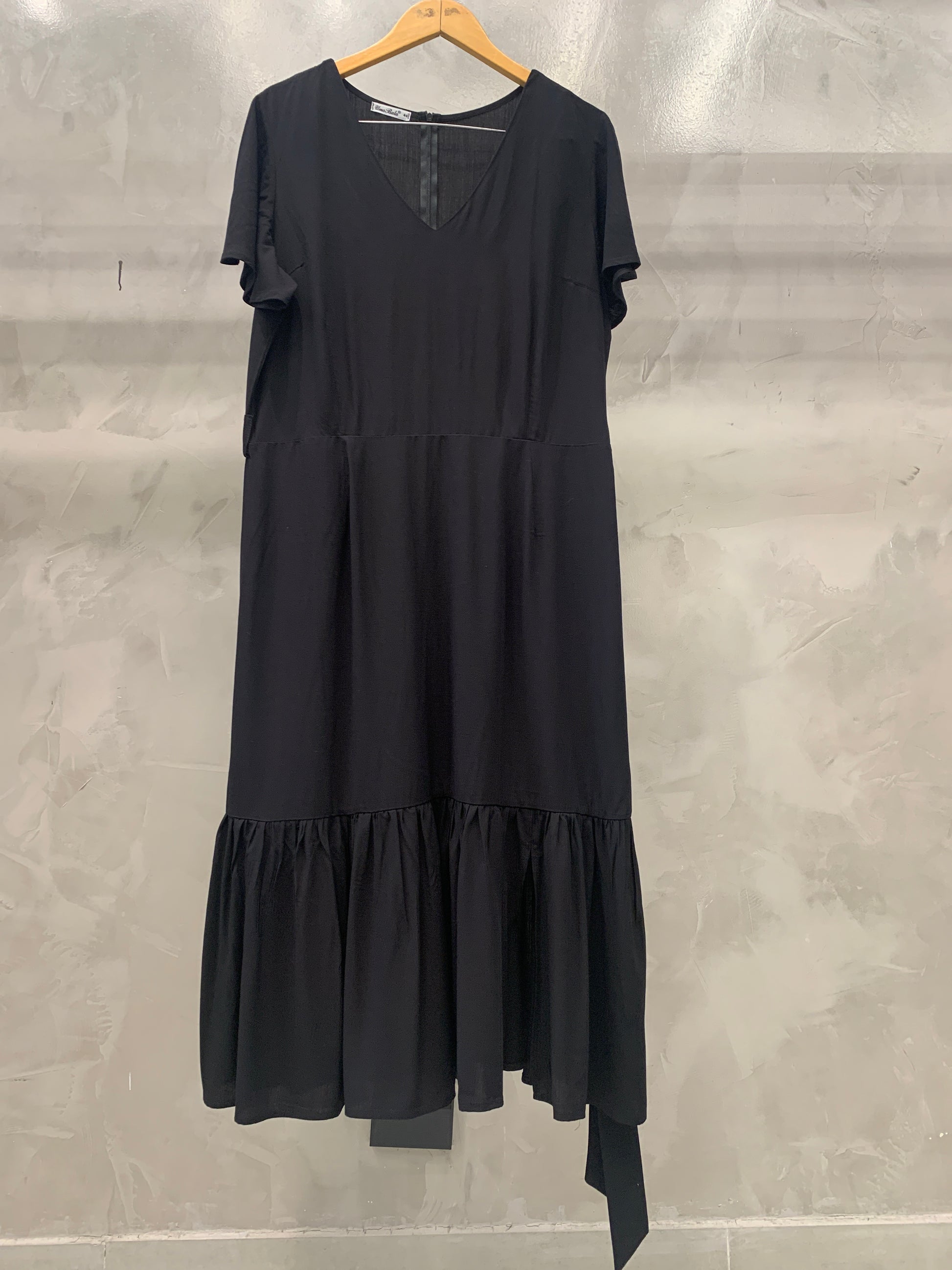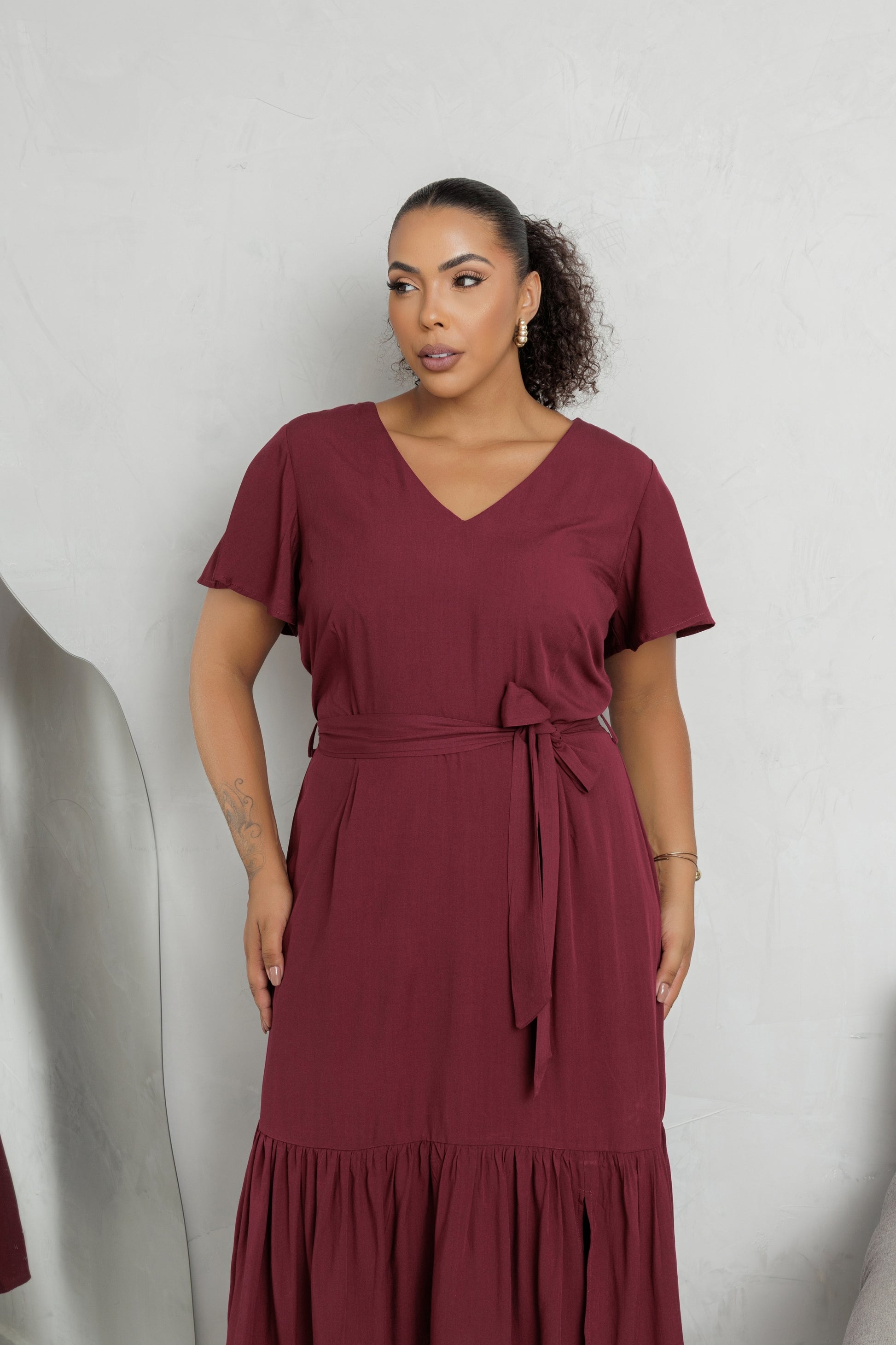 Vestido Plus liso comprimento longo cpm decote quadrado. Tem detalhes de babados na manga e na barra. É uma peça acinturada tendo elástico na cintura e faixa do mesmo tecido para amarração. Confeccionada no Viscose, possui forro